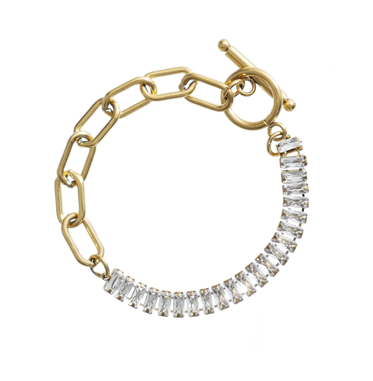 Introducing your new favorite dynamic duo! This tennis and paper clip bracelet is a match made in fashion heaven, blending classic elegance with a modern twist for a look that's truly unforgettable. Crafted from waterproof 18K gold-plated stainless steel, this bracelet is designed to be a staple in your collection, effortlessly complementing your style with its timeless charm. Embellished with squared crystals that sparkle with brilliance, it adds the perfect touch of glamour to any ensemble. For the ultimate style statement, pair it with the matching choker and prepare to turn heads wherever you go!