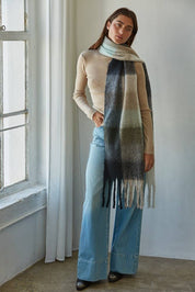 Knit Sweater Polyester Gingham Pattern Fringe Detail Scarf