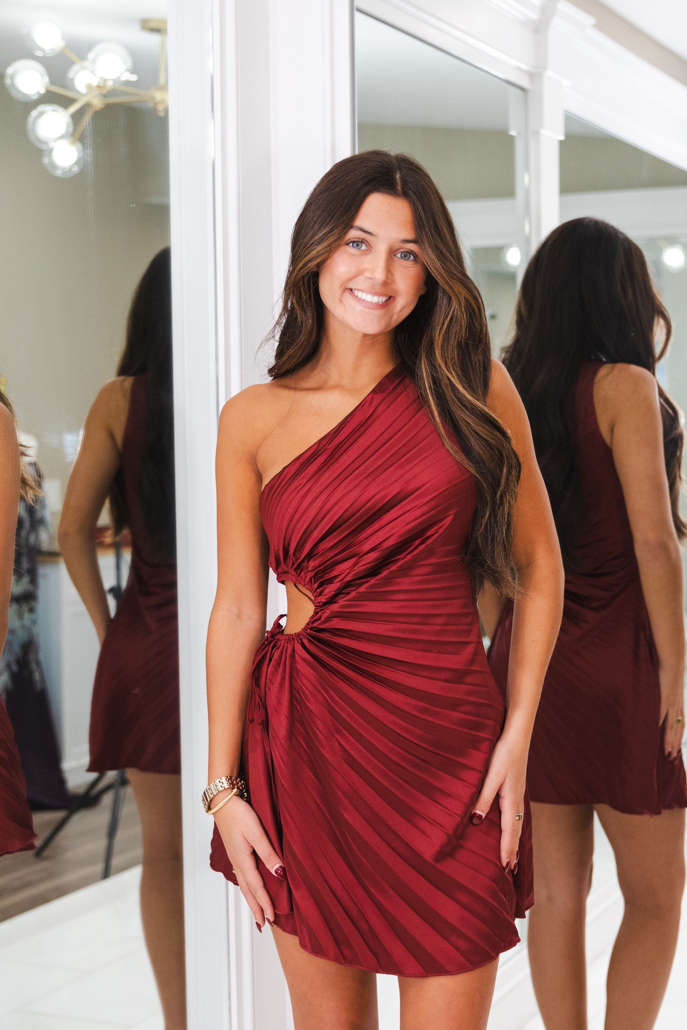One shoulder mini dress with crinkle pleating and side cut out.