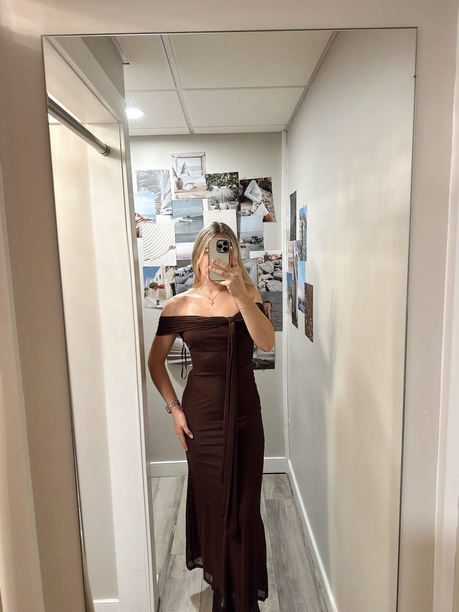 Gorgeous mesh maxi dress with an off the shoulder fold over sleeve.