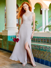 Effortlessly beautiful is our feminine chantilly lace bodice with the narrow straps and v front and back accented by two satin bands at the natural waist. A soft A-line chiffon skirt with a front side slit shows her daring side. *This style is unable to be ordered in any other size or color*