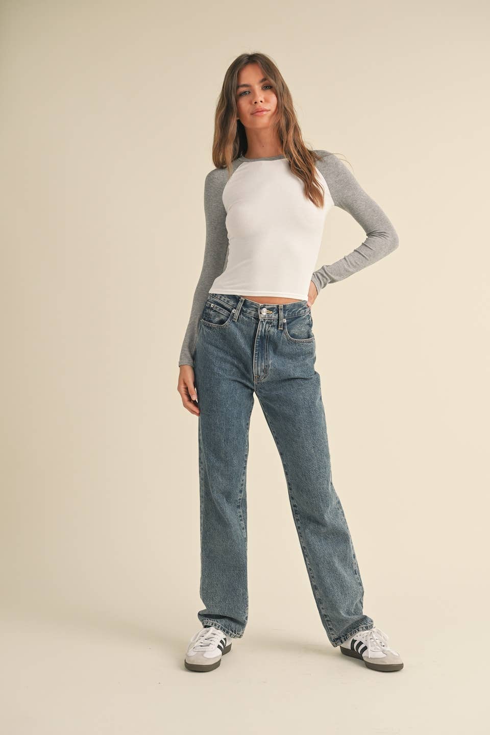 Y2K-inspired slim fit long sleeve raglan tee with a color block design, made of soft baby rib fabric.