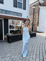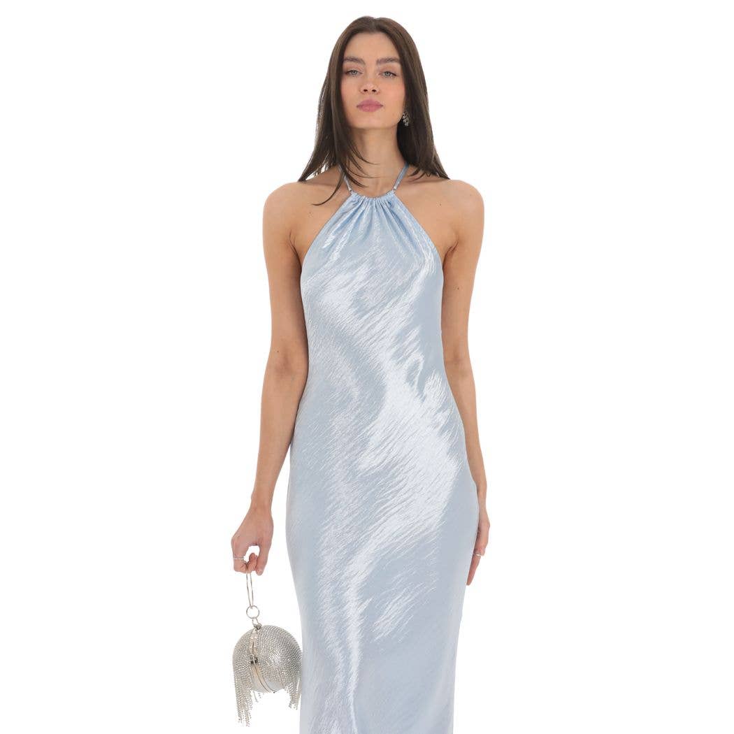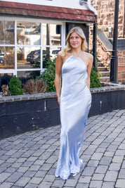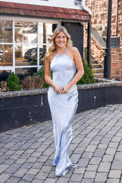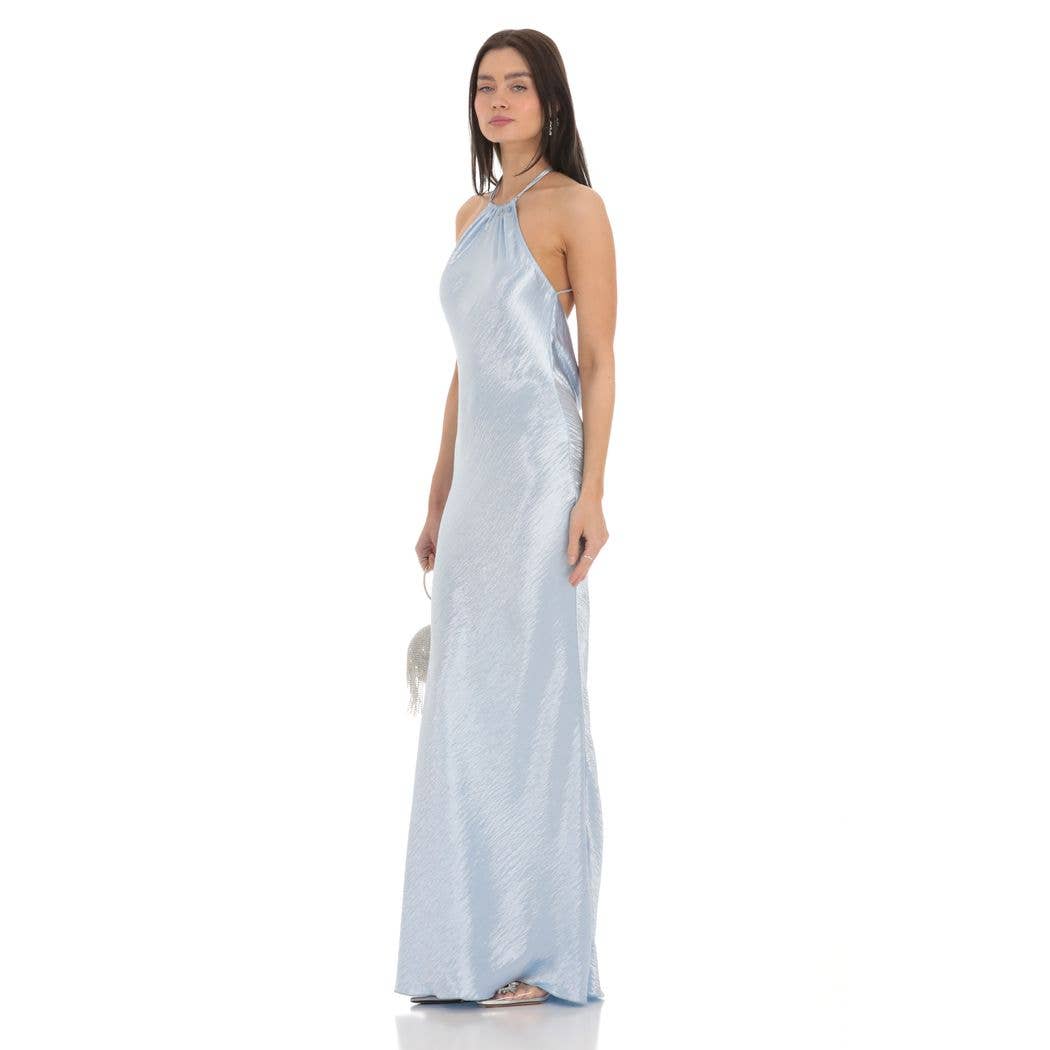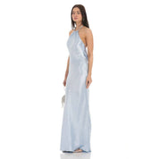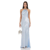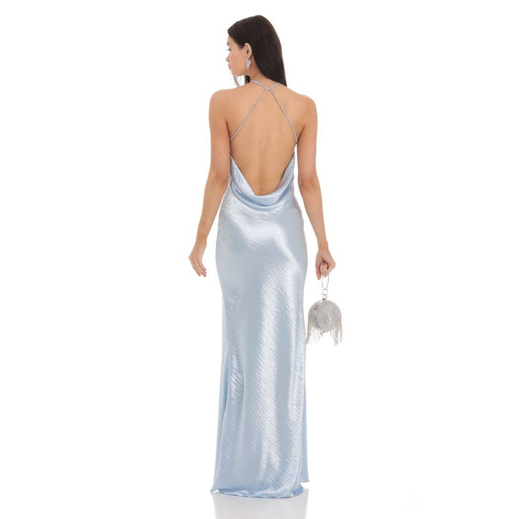 Rhinestone Satin Open Back Maxi Dress in Blue