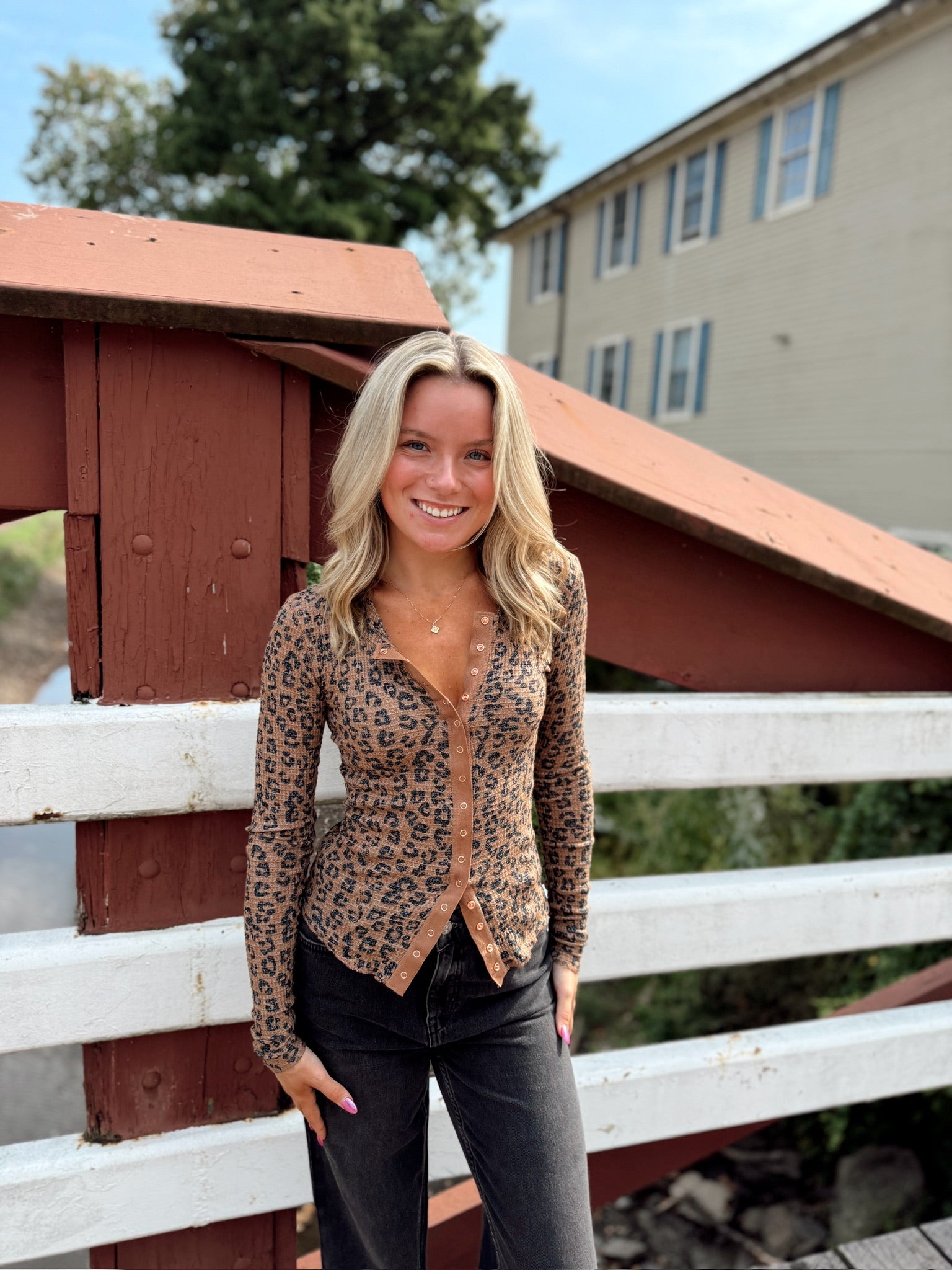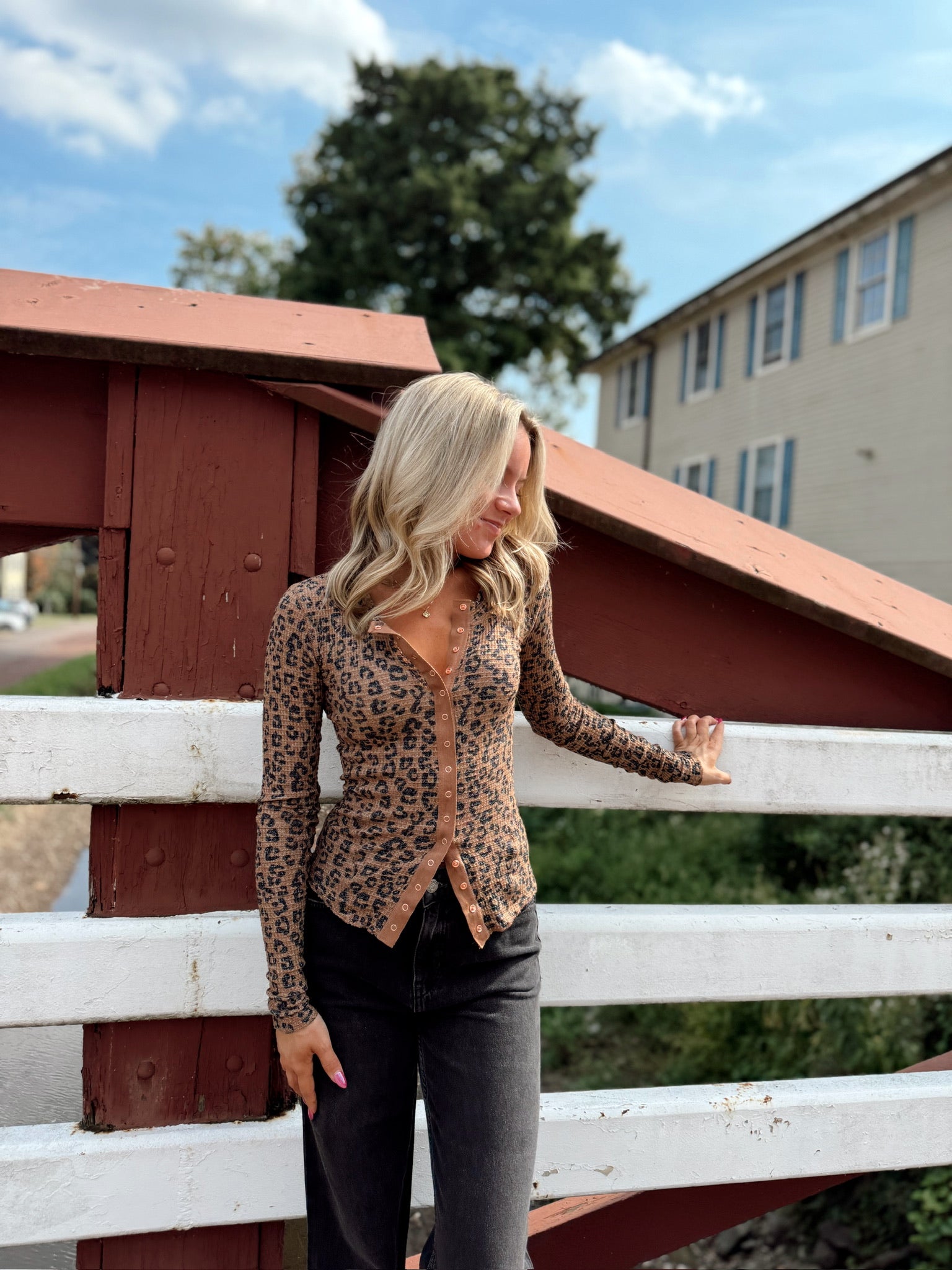 Features: Button-front closure, waffle knit fabrication, crew neckline, long fitted sleeves