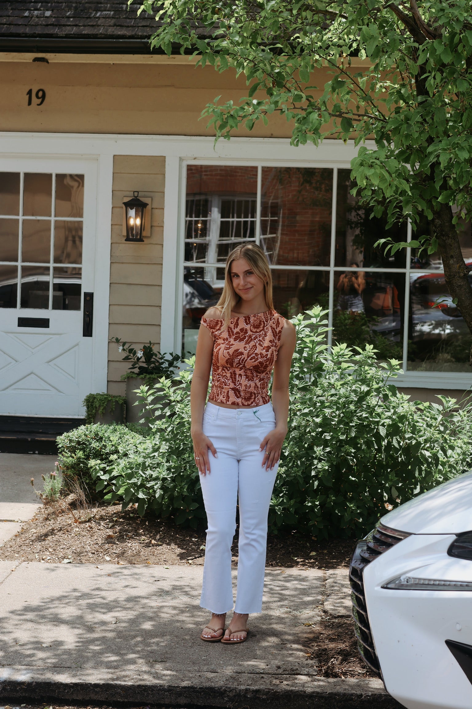 So chic in a smocked fabrication, this printed top features a slim fit and off-the-shoulder neckline in a classic hip-length silhouette.