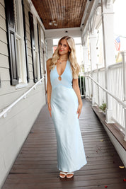 Beautiful maxi dress perfect for a formal evening, wedding guest, date night, and more! This style features a mesh double layered bodice with a halter tie and a satin skirt.