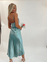 Cowl neck spaghetti strap mid-length satin dress with slit detail and adjustable straps.