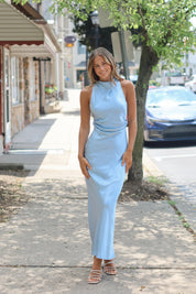 Beautiful satin high neckline maxi dress with open back and thick straps that cross.