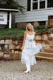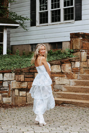 Floral printed tiered midi dress with bow detail.