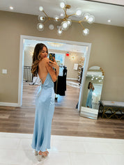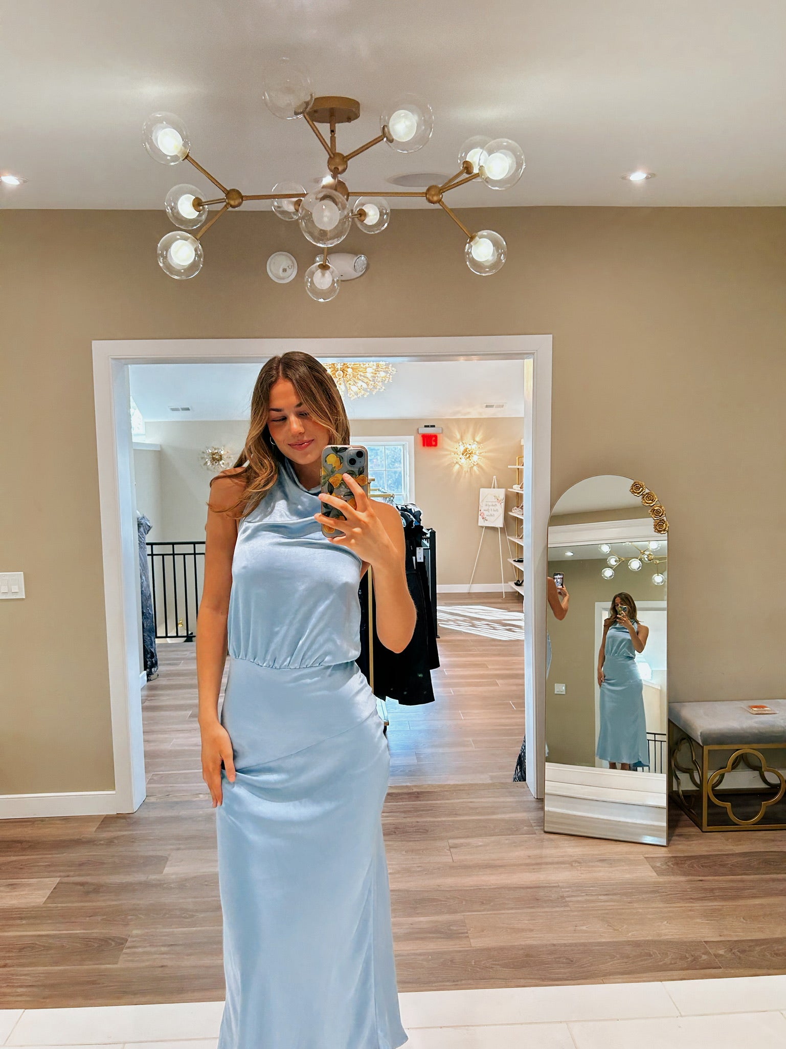 Stunning blouse top maxi dress with a mockneck and fully open back. The back of this dress features two rhinestone straps that tie across the back for the perfect touch.