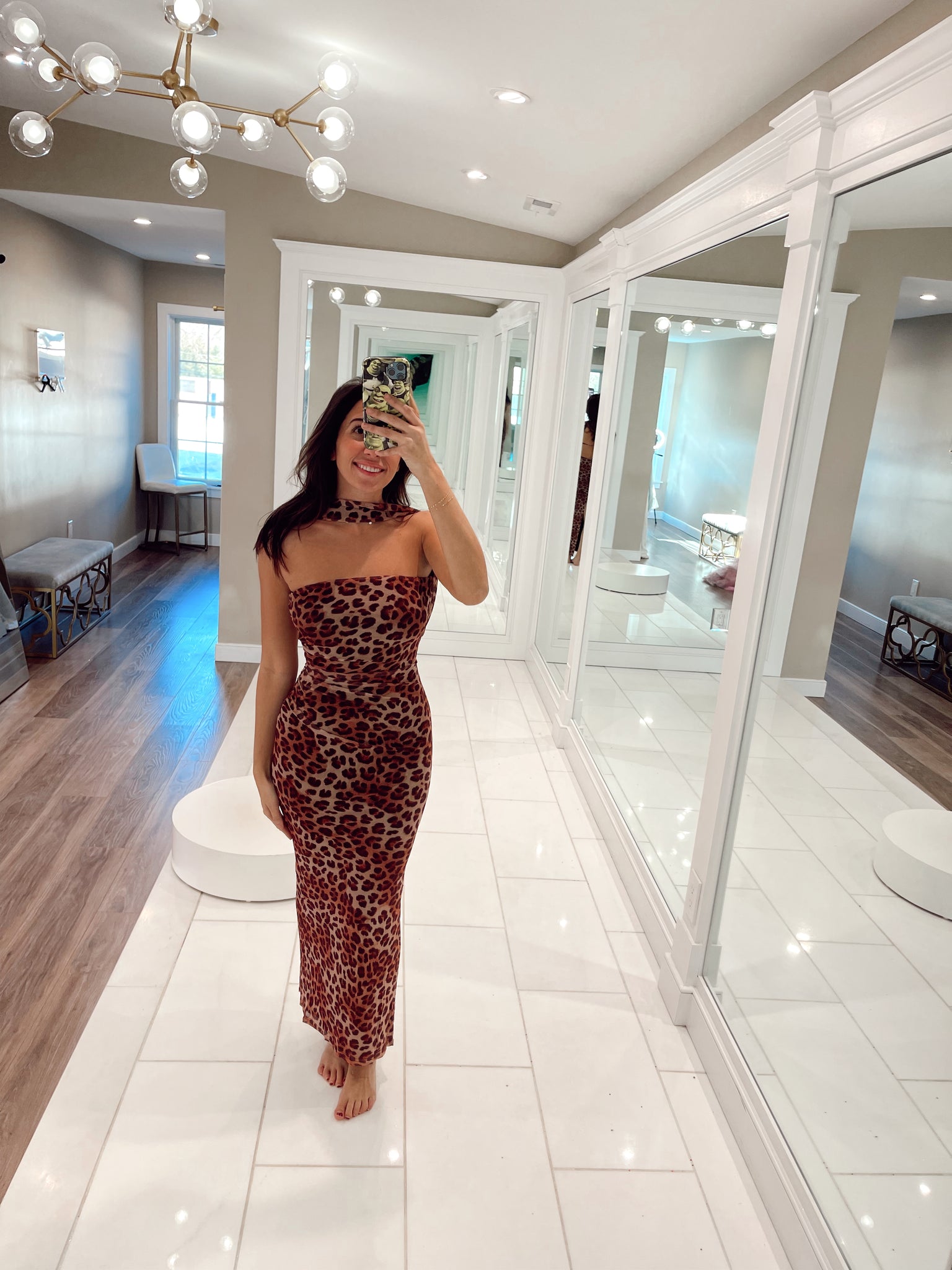 Our Antonie Midi Dress is a unique sultry piece, with the illusion of a strapless neckline and an open back all in a leopard print, perfect for date night.