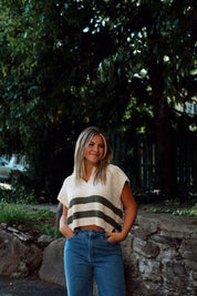 Sleeveless light weight sweater with slight v-neck cut and stripes.