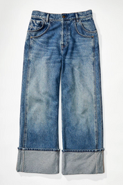 Features: Six-pocket design, sewn cuffed hemlines, zip fly and button closure, lightweight rigid denim