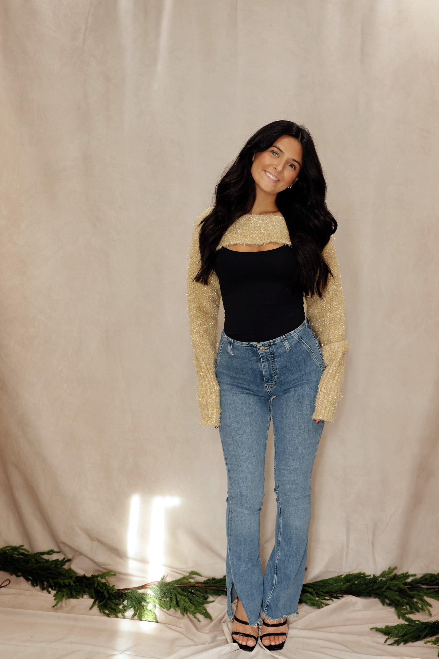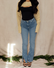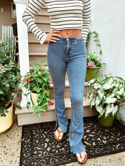 Fit: Slim, curve-hugging silhouette with flared hemline & mid-rise