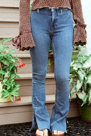 Features: Zip fly and button closure, four-pocket design, soft stretch denim, slit hem feature