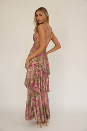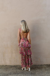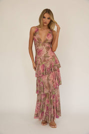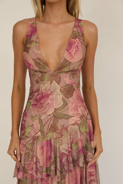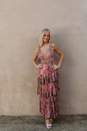 Mesh maxi dress with plunging neckline and drop waist detail.
