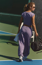 Features: Soft, jersey fabrication; relaxed fit; cropped muscle tee top with seaming detail; ankle length pant with high-rise waist and wide leg; elasticated waistband and cuffs; crossover detail on top; ribbed collar; side seam pockets