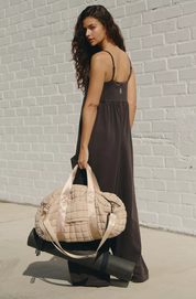 Features: Pull-on silhouette; slightly fitted, square-neck bodice; adjustable, spaghetti-style straps; pleated detailing at empire waist; slouchy patch pockets; oversized, wide legs; zipped logo pocket at back.