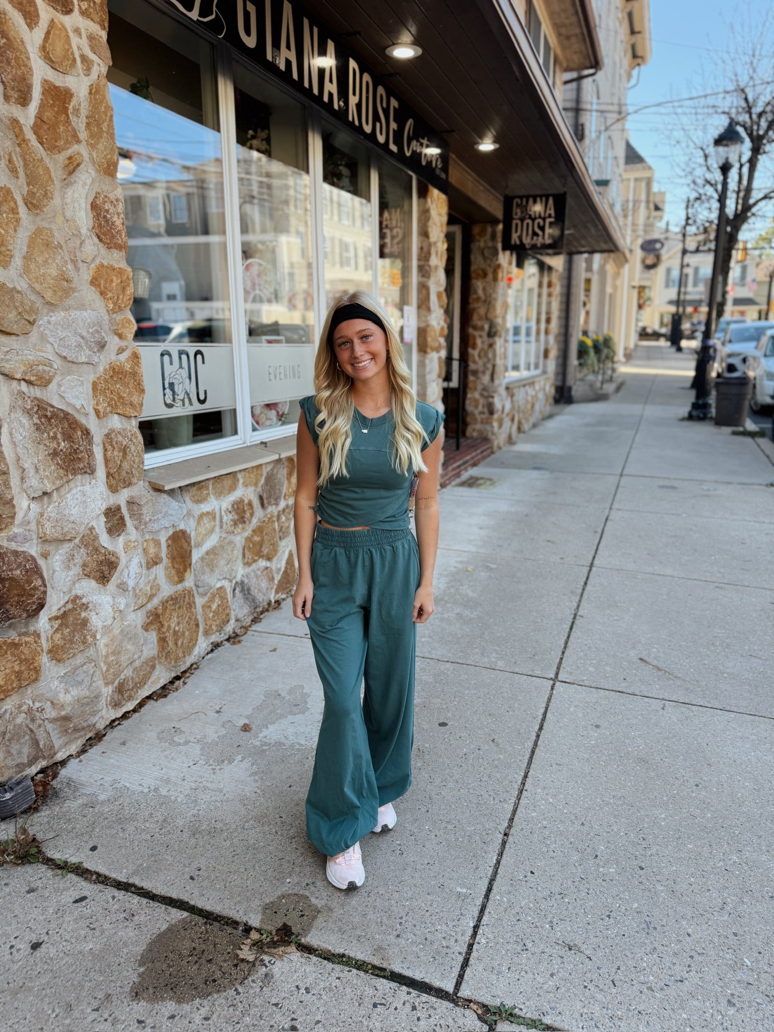 Features: Soft, jersey fabrication; relaxed fit; cropped muscle tee top with seaming detail; ankle length pant with high-rise waist and wide leg; elasticated waistband and cuffs; crossover detail on top; ribbed collar; side seam pockets