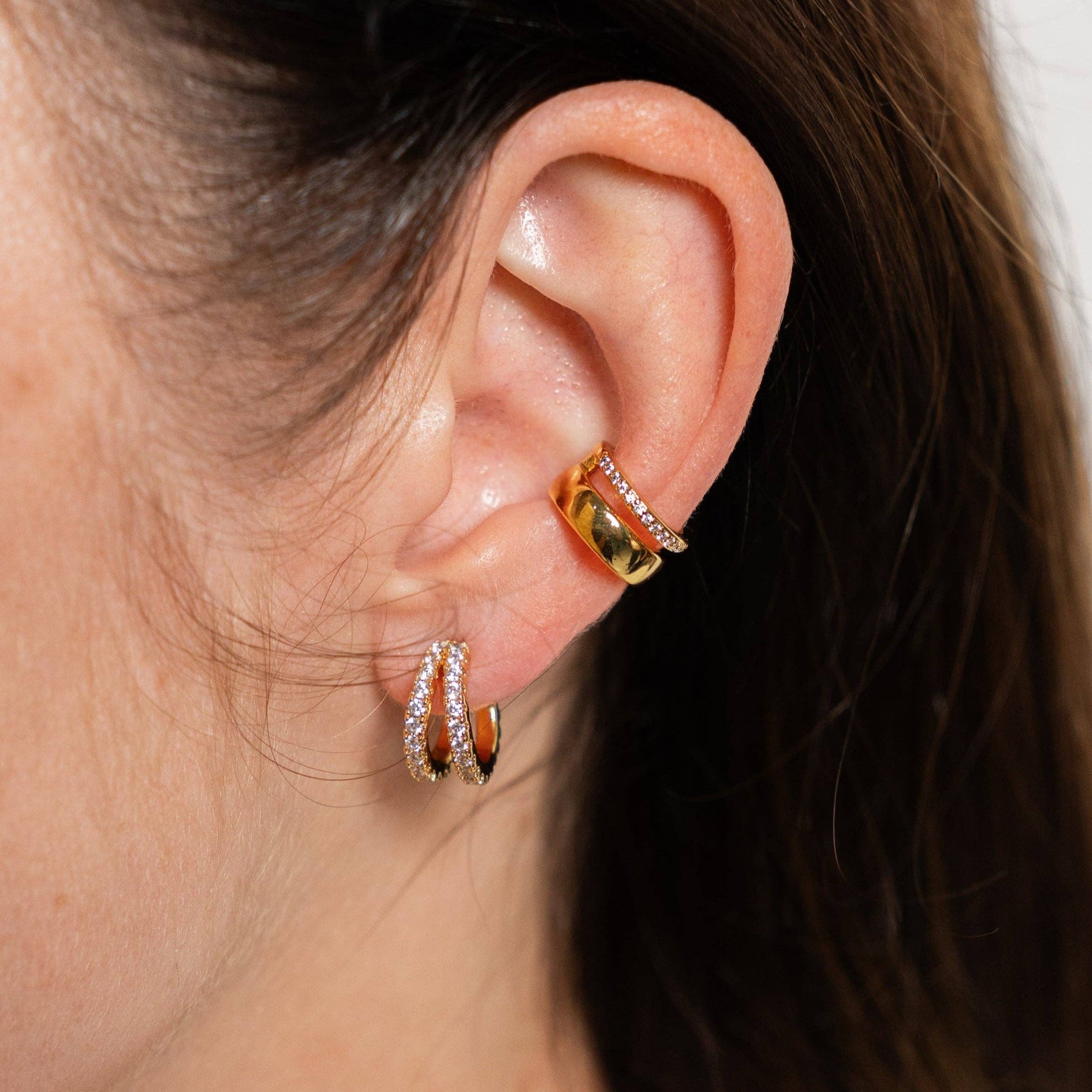 Two earrings in one. These gold pavé hoops combine classic links with a bold twist—lightweight, stylish, and made to shine every day.