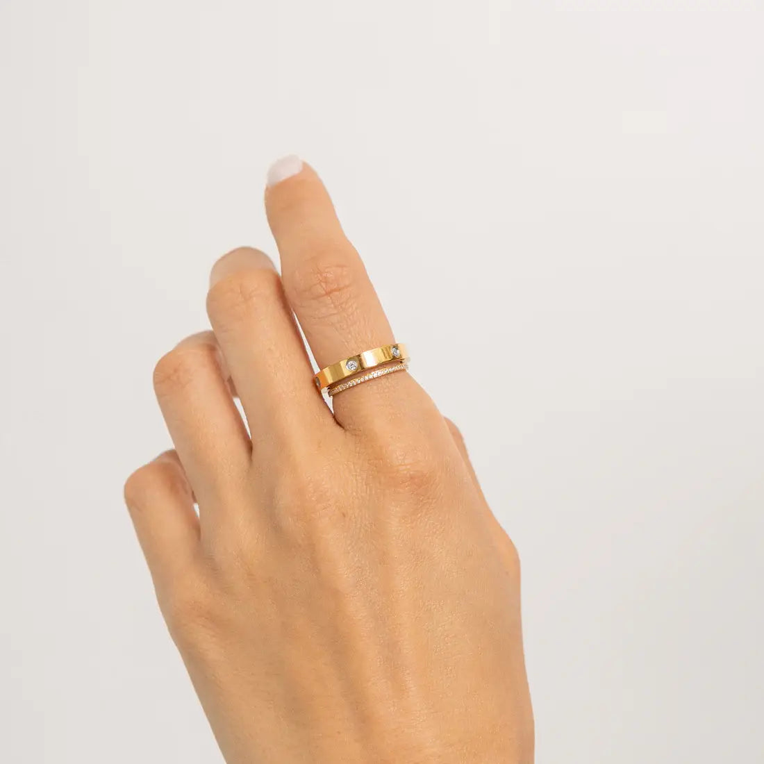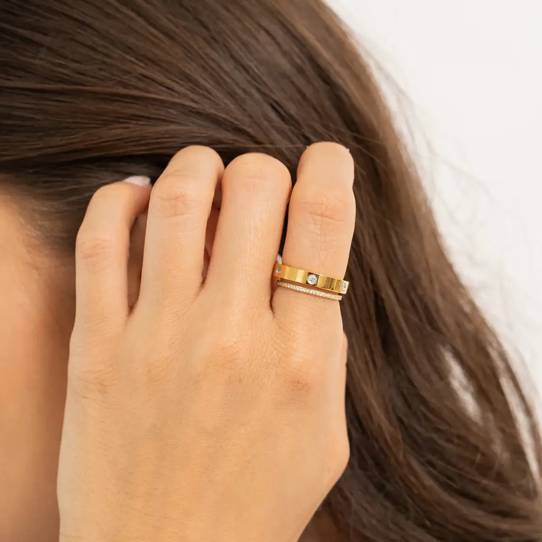 Add some bling to your fingers with our diamond ring band. Subtle yet stunning, it’s perfect for stacking or wearing solo. Made from Stainless Steel - Waterproof. with a robust layer of 18K gold, waterproof and made to live in, featuring stones that look like real diamonds.