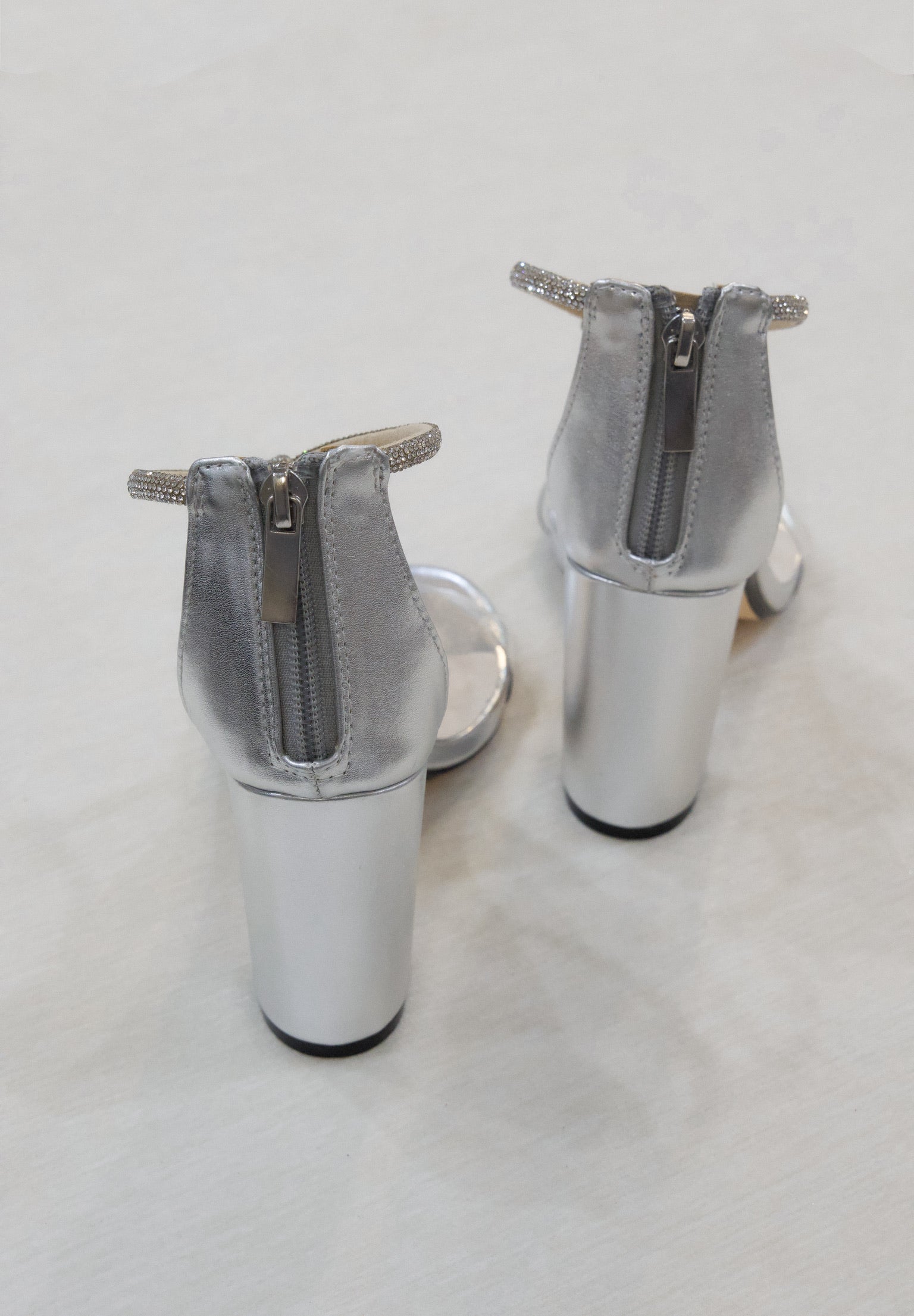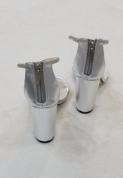Sienna from Touch Ups is an absolute stunner! She has a sturdy 3" block heel, and a vinyl vamp to ensure fit. She is finished in a silver metallic and has a zipper that makes it easy to put on or take off. Perfect for any special occasion.