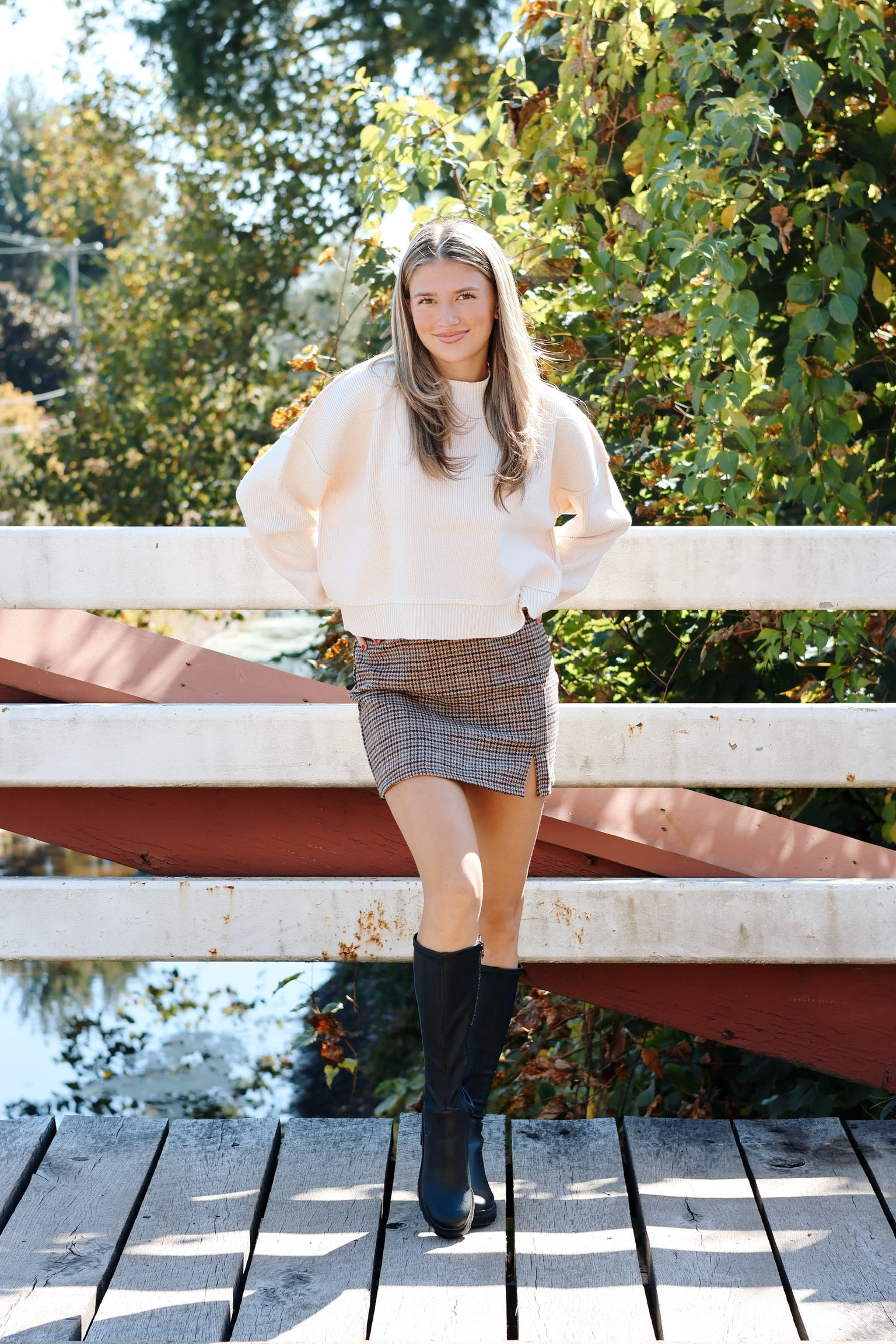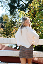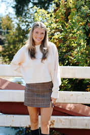 Hey upper eastsiders this one is for you! The Georgina Mini Skirt is giving fall in Central Park with a caffe latte in your hand. Features a houndstooth pattern.