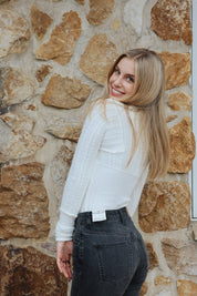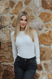 So soft and ultra-cozy, this textured bodysuit is featured in a long-sleeve silhouette and fuzzy fabrication with cable knit detailing and exaggerated cuffs.