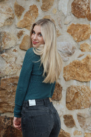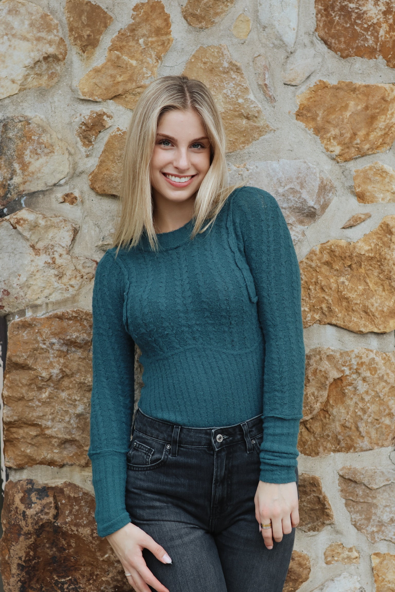 So soft and ultra-cozy, this textured bodysuit is featured in a long-sleeve silhouette and fuzzy fabrication with cable knit detailing and exaggerated cuffs.