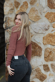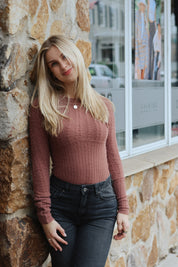 So soft and ultra-cozy, this textured bodysuit is featured in a long-sleeve silhouette and fuzzy fabrication with cable knit detailing and exaggerated cuffs.