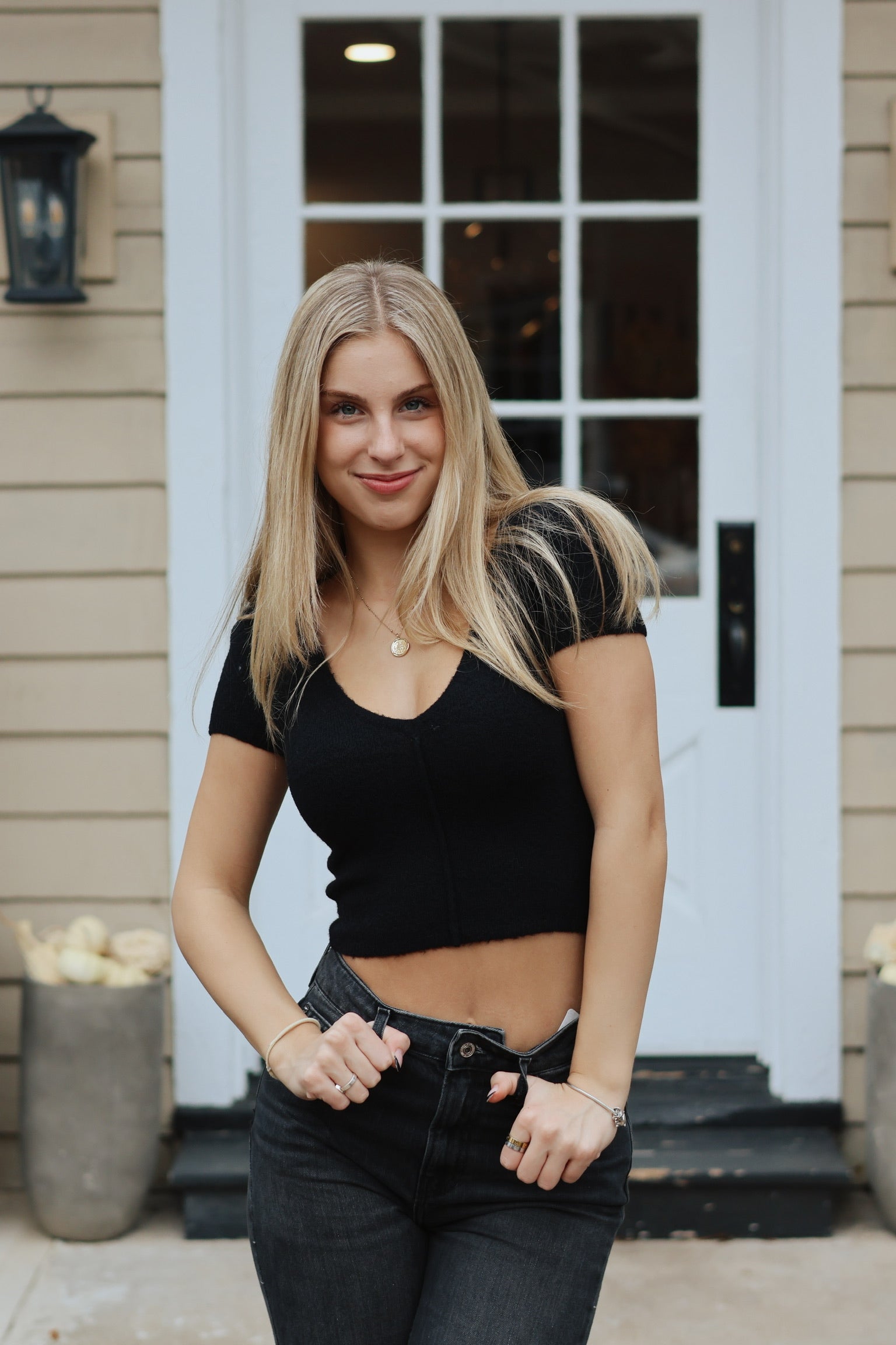 So soft and ultra-cozy, this textured top is featured in a short-sleeve silhouette and cropped style with a low scoop neckline and raised seam detail.