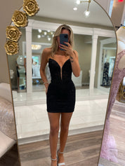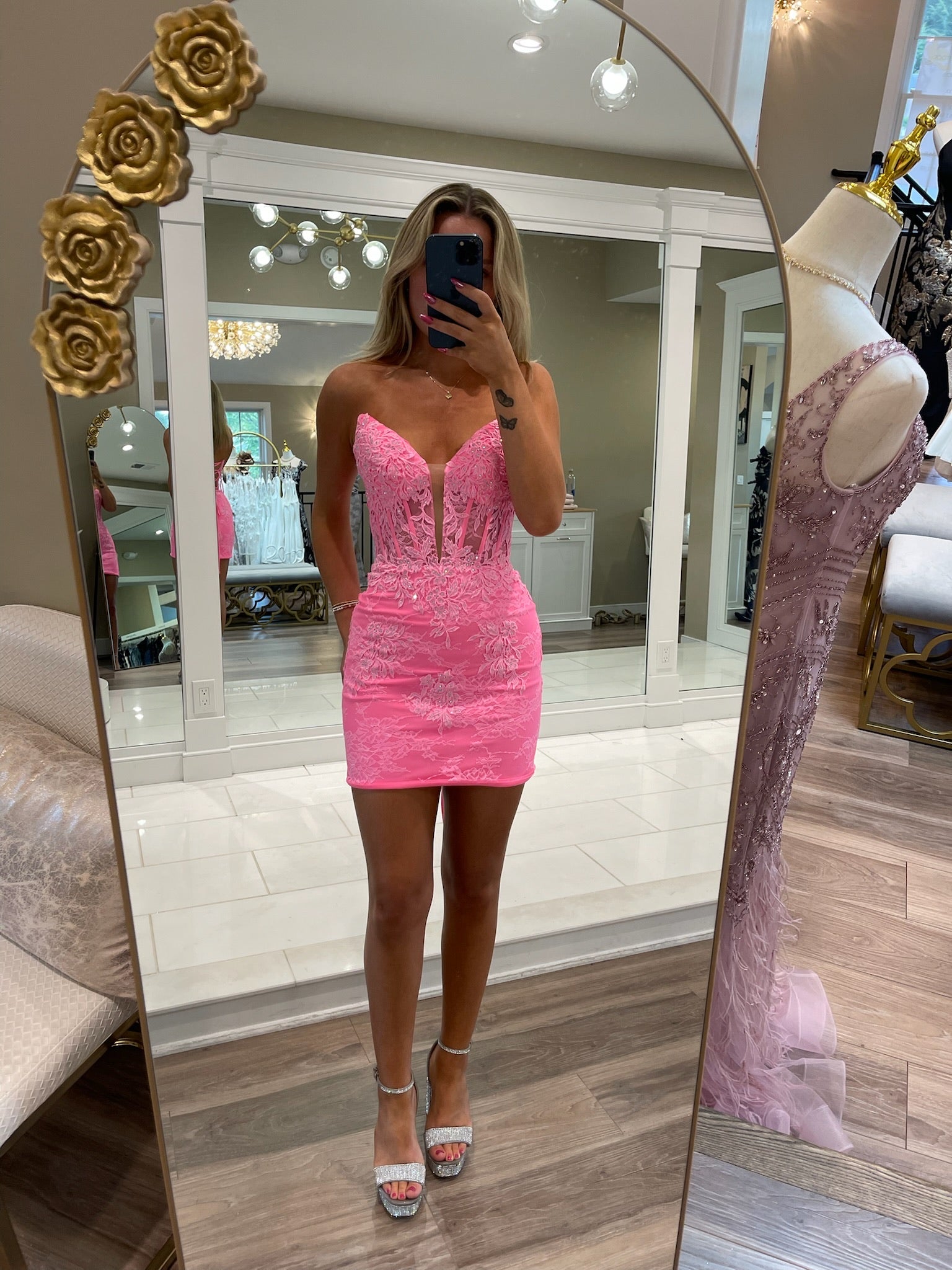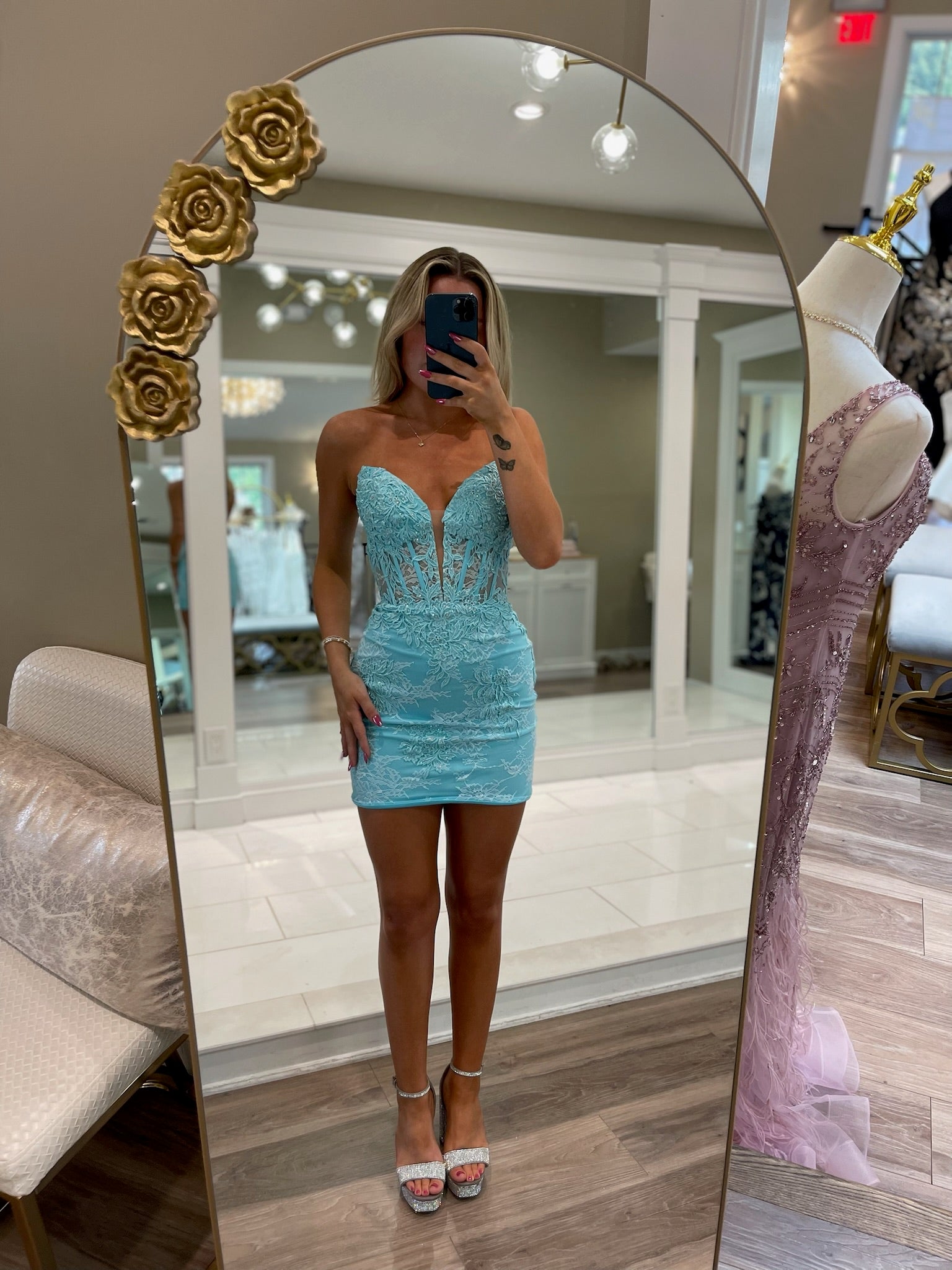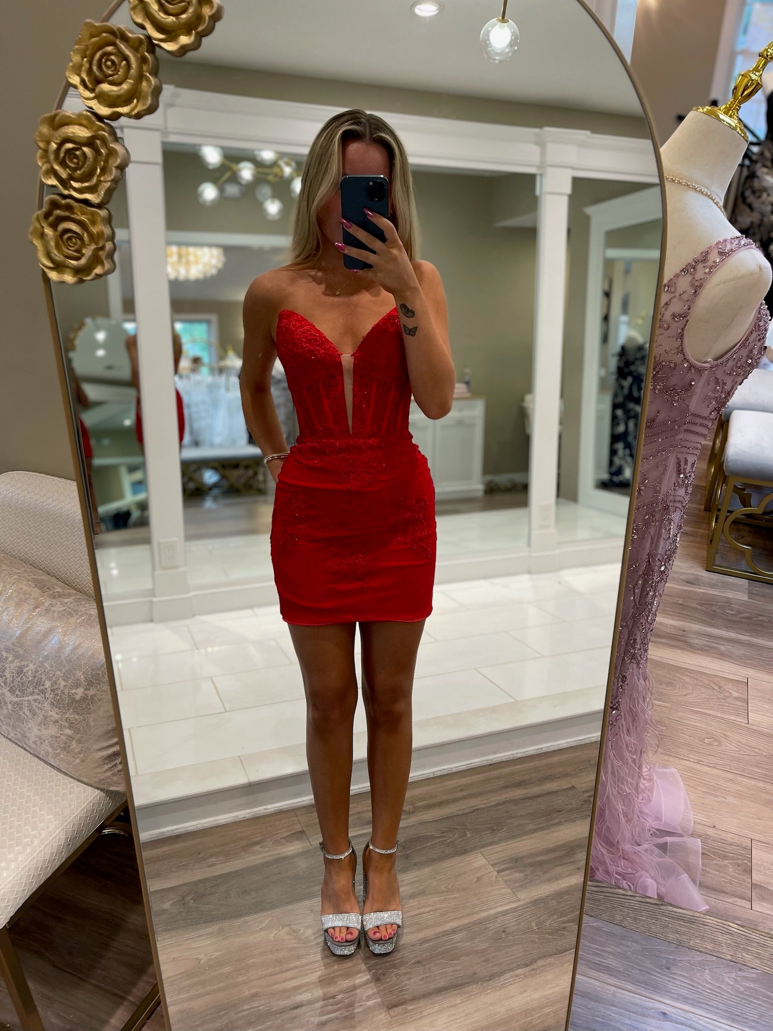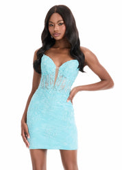 Turn heads in the ASHLEYlauren Style 4880 mini dress, featuring intricate lace applique throughout the dress. This strapless sweetheart neckline style includes a daring sheer plunge and a lace-up corset back for a custom fit and added allure. Perfect for cocktail parties, formal events, or a night out.