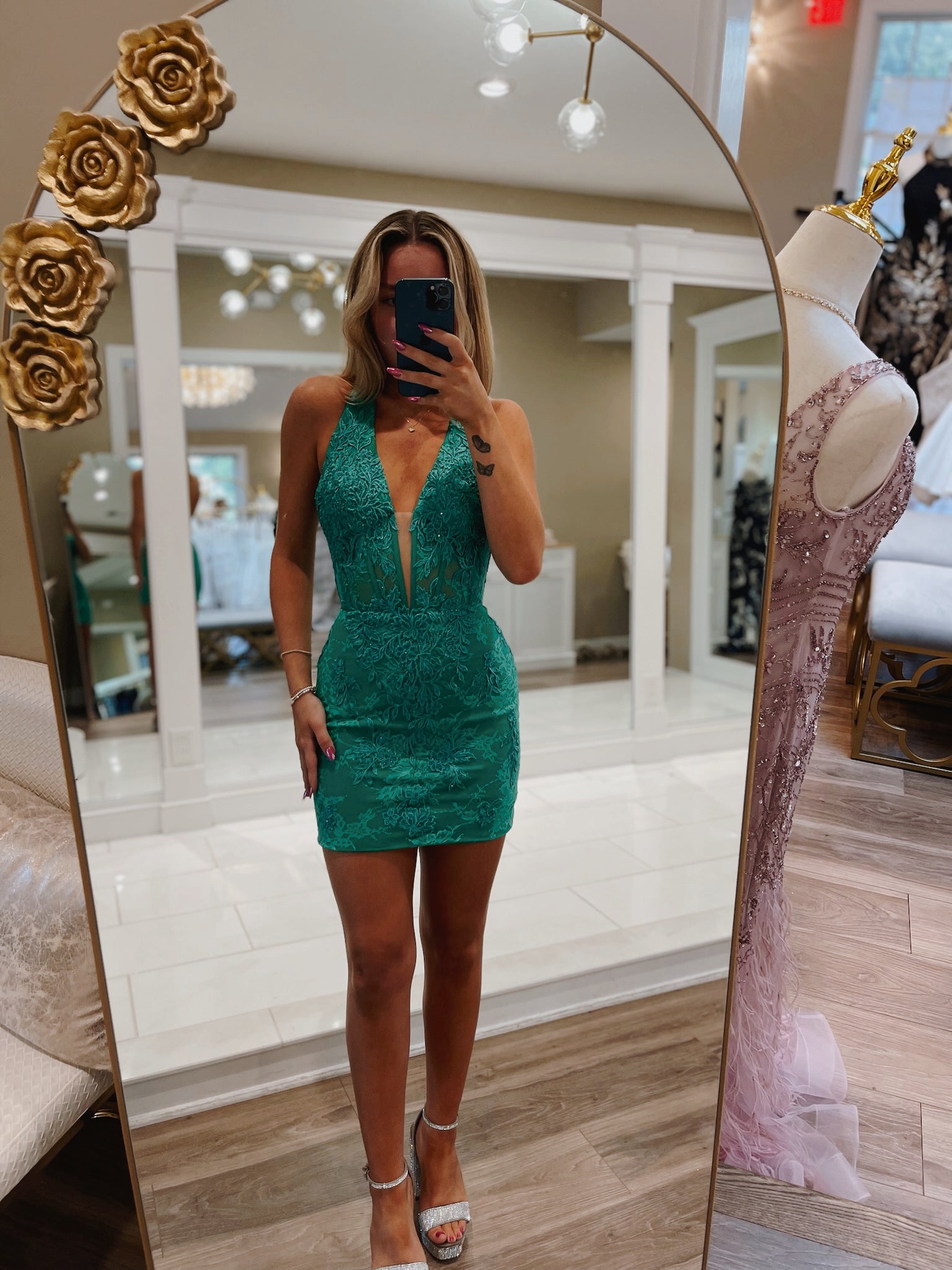 Mini length with a fitted cut, halter neckline, and sheer plunging neckline for a bold and elegant look.