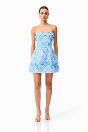 Turn heads in the Roseate Floral Mini Dress in Blue—a stunning piece that combines soft romance with modern flair. This strapless mini party dress is crafted from intricate 3D floral lace, offering beautiful dimension and a touch of whimsy in every detail.
