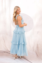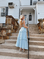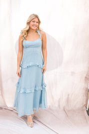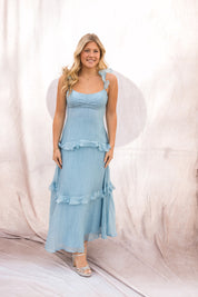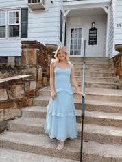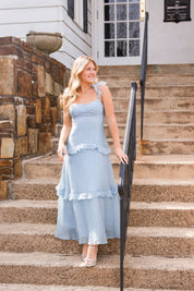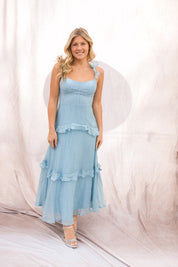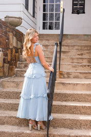 Sweet and elegant midi dress with tiered layers and wide straps.