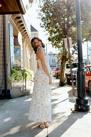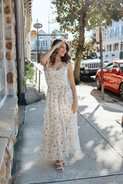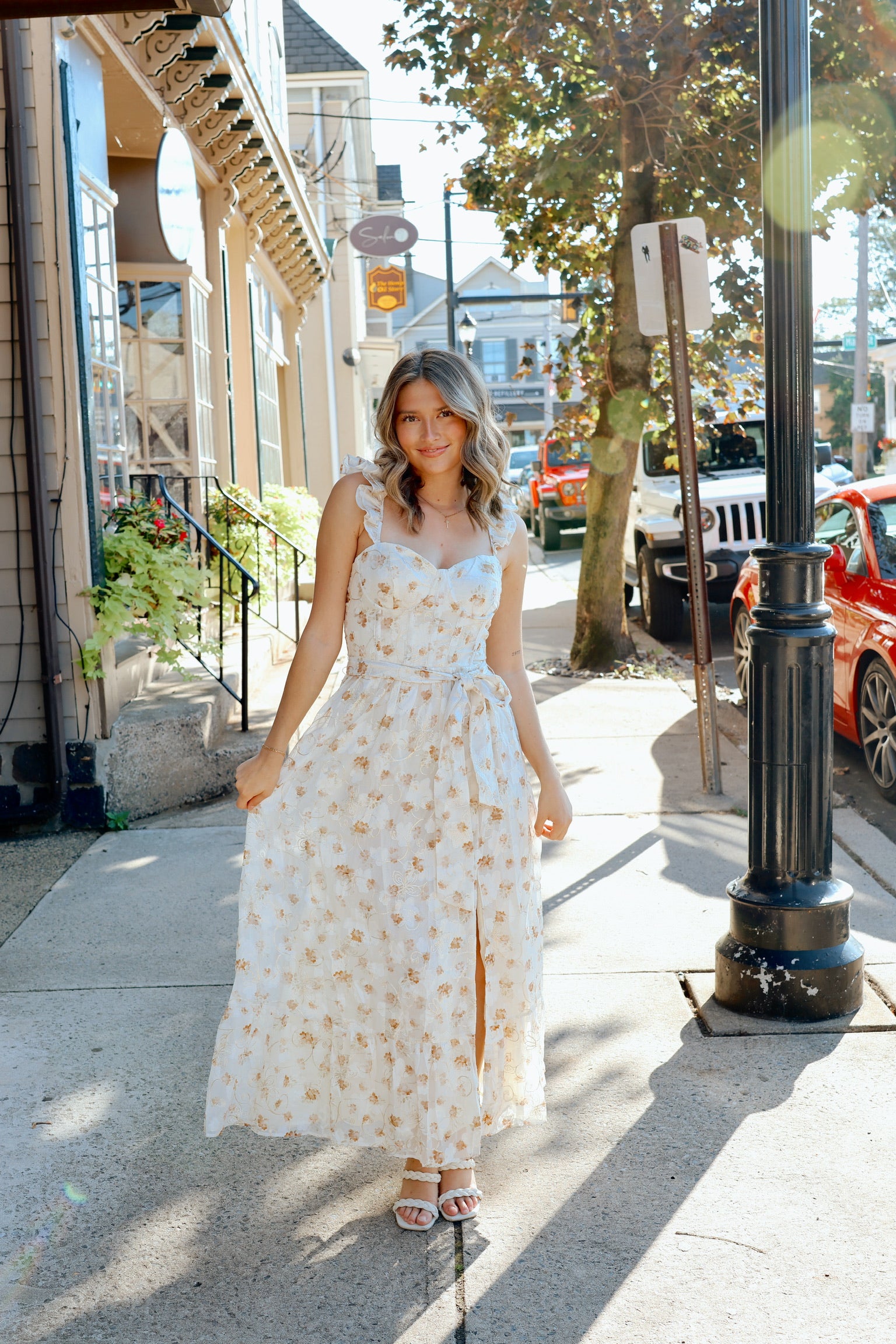 Romantic and sweet this midi dress features a bustier top with frill shoulder straps that adjust and a waist tie.