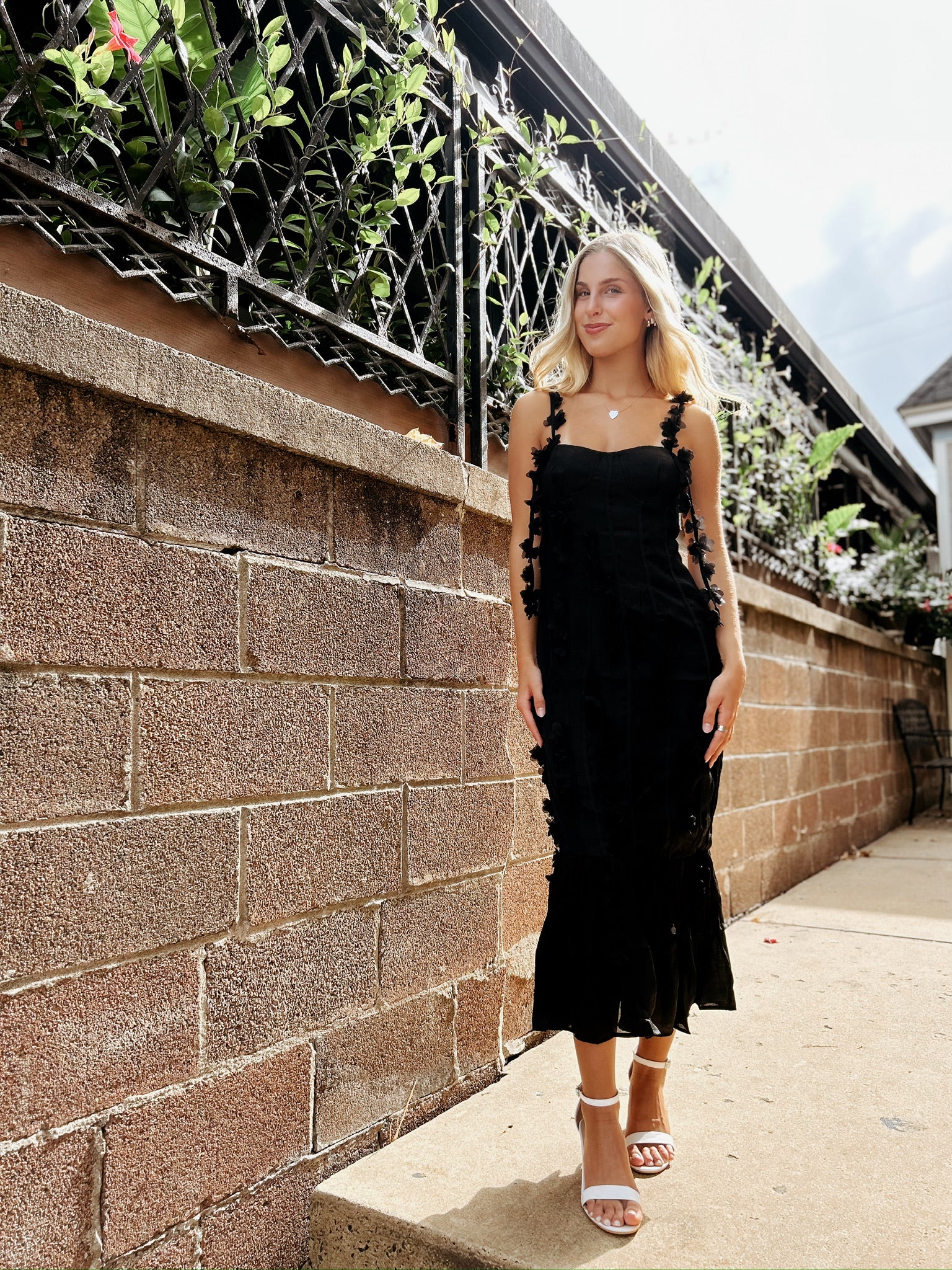 Gorgeous 3D applique mid length dress with bustier and adjustable straps. Enhances your curves and is oh-so romantic!!