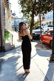 Black midi dress with white piping.