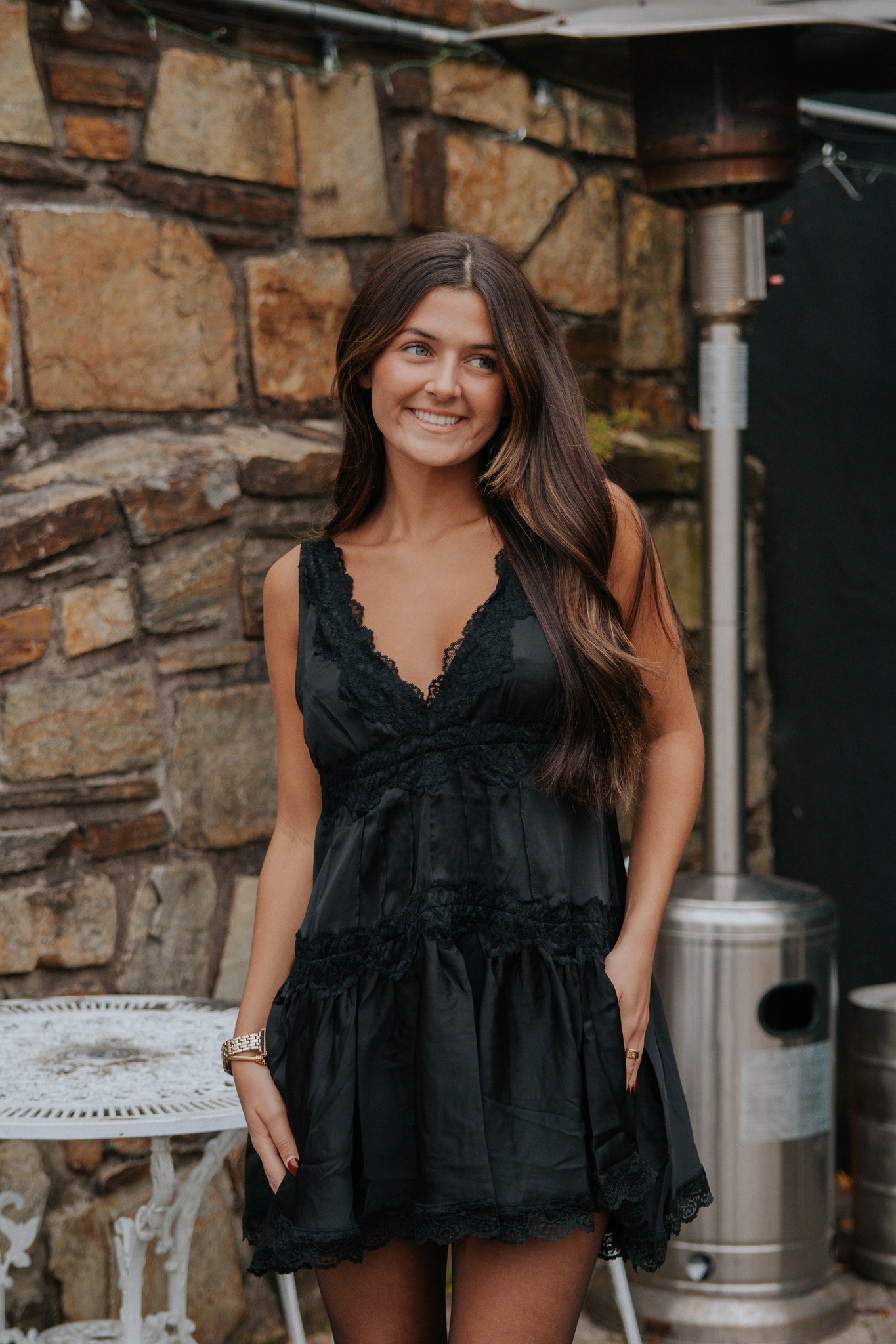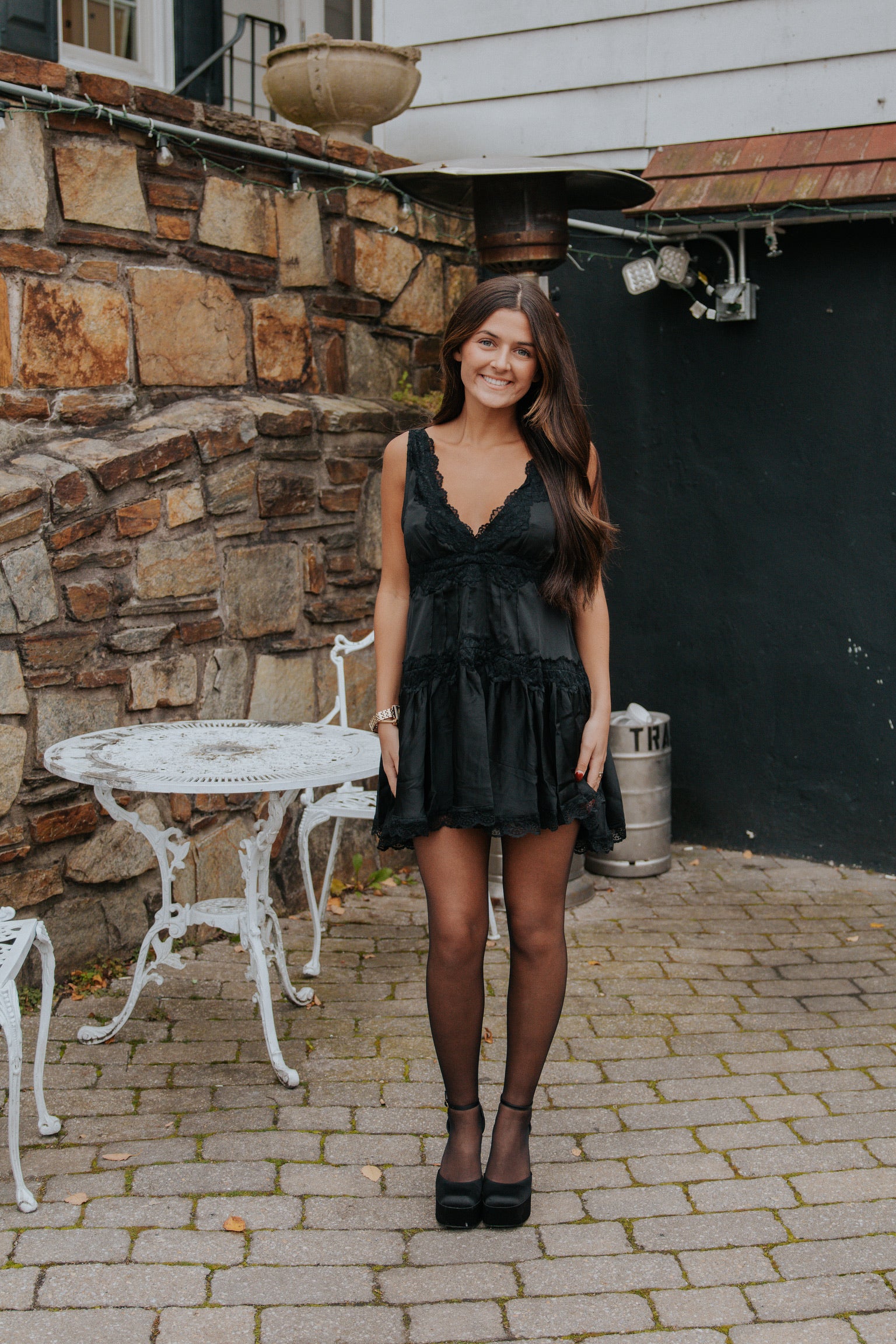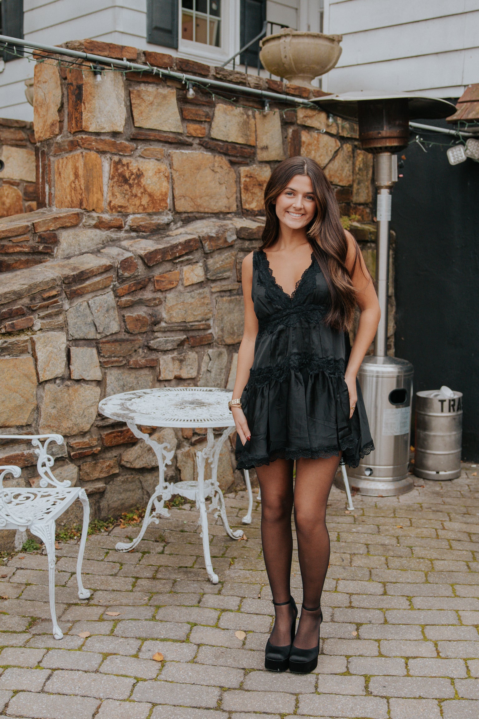 Features: Silky fabrication, babydoll style, V-neckline, tiered design, lace trim