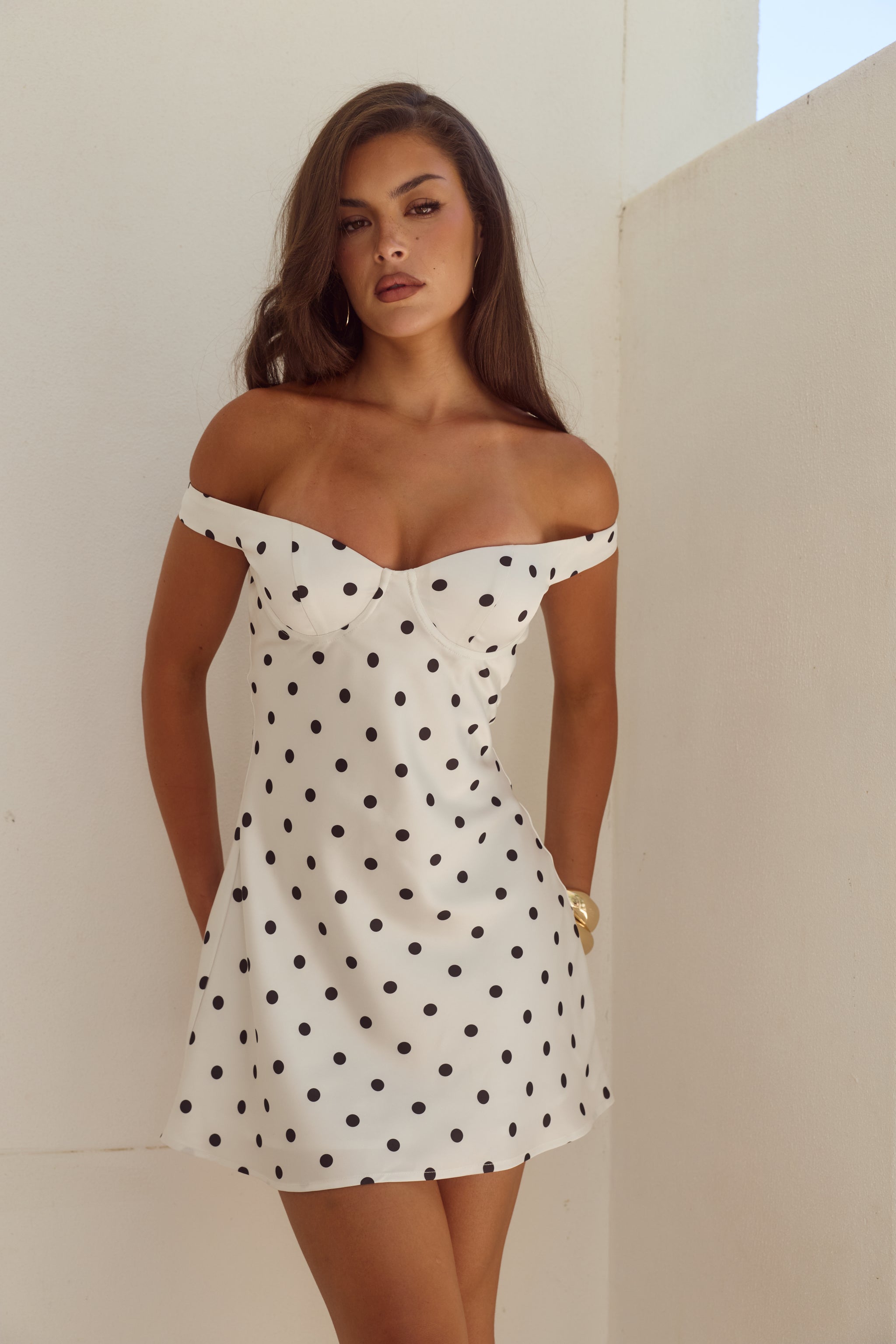 AVETA OFF SHOULDER MINI DRESS - WHITE/BLACK POLKA