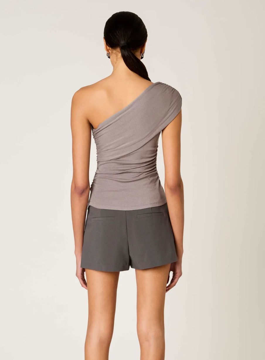The Coldwater Top brings modern structure to soft, sculptural lines. With its asymmetrical one-shoulder neckline and wrapped draping across the chest, it’s a statement piece that balances ease and intention. Ruching along the side adds texture and movement, while the fitted silhouette skims the body for a sleek, polished finish. Designed to pull on with no closures, it’s a versatile option that pairs beautifully with both tailored and flowy bottoms.
