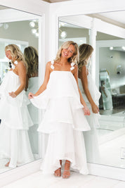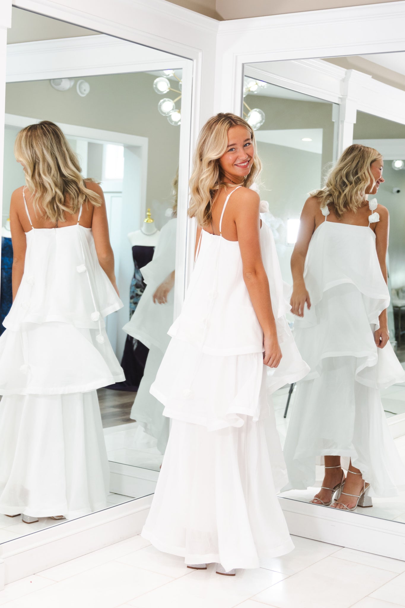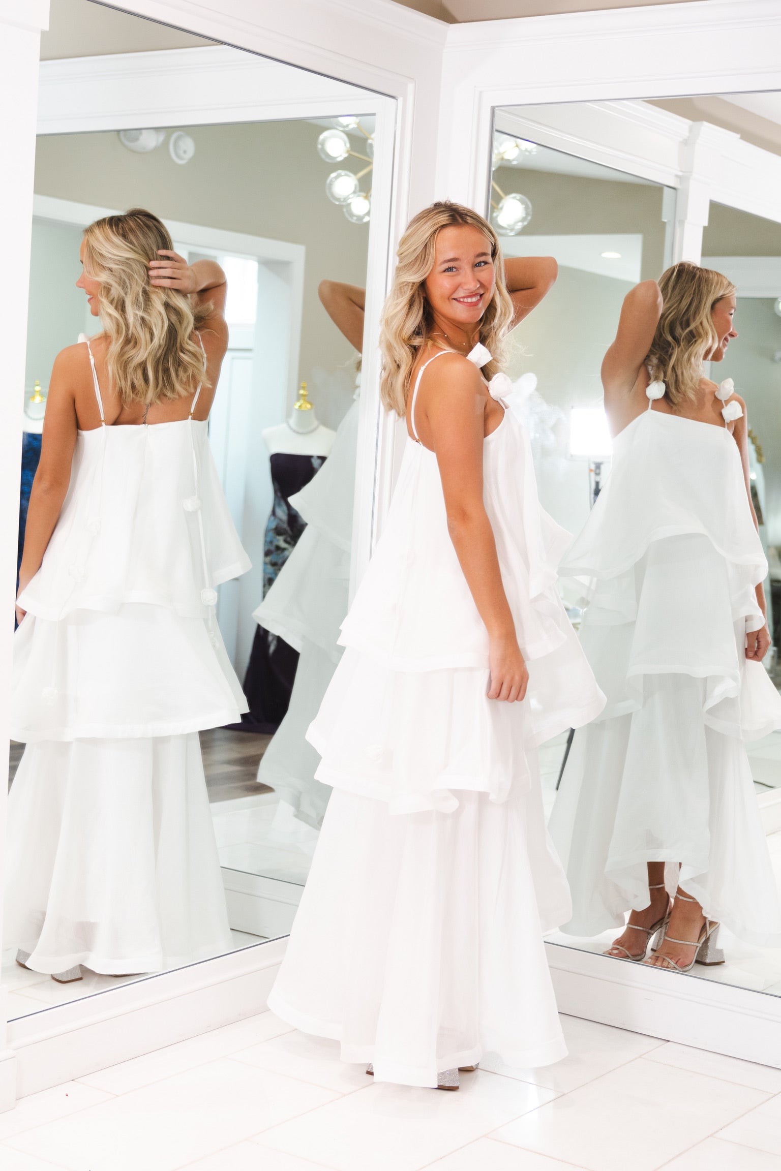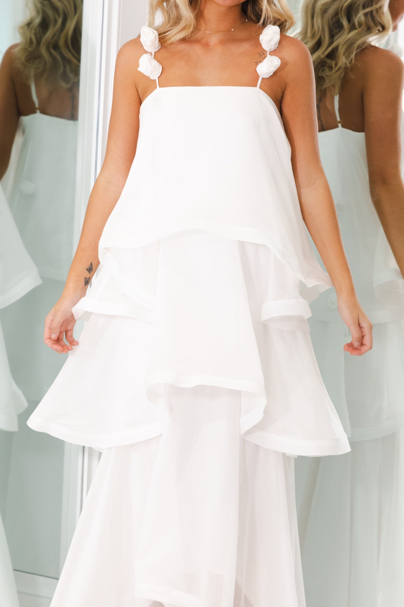 With a straight neckline and adjustable straps trimmed with delicate rose accents, the bodice flatters while offering a customizable fit. The relaxed fit through the body and softly cascading tiers add a dreamy silhouette that moves beautifully as you walk.