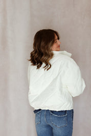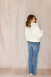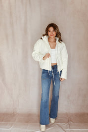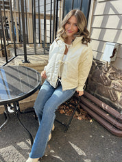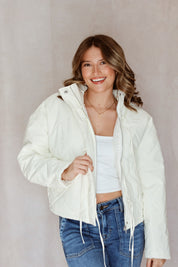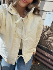 Oversized bomber coat with ties that attach to make bows in front of the zipper.