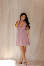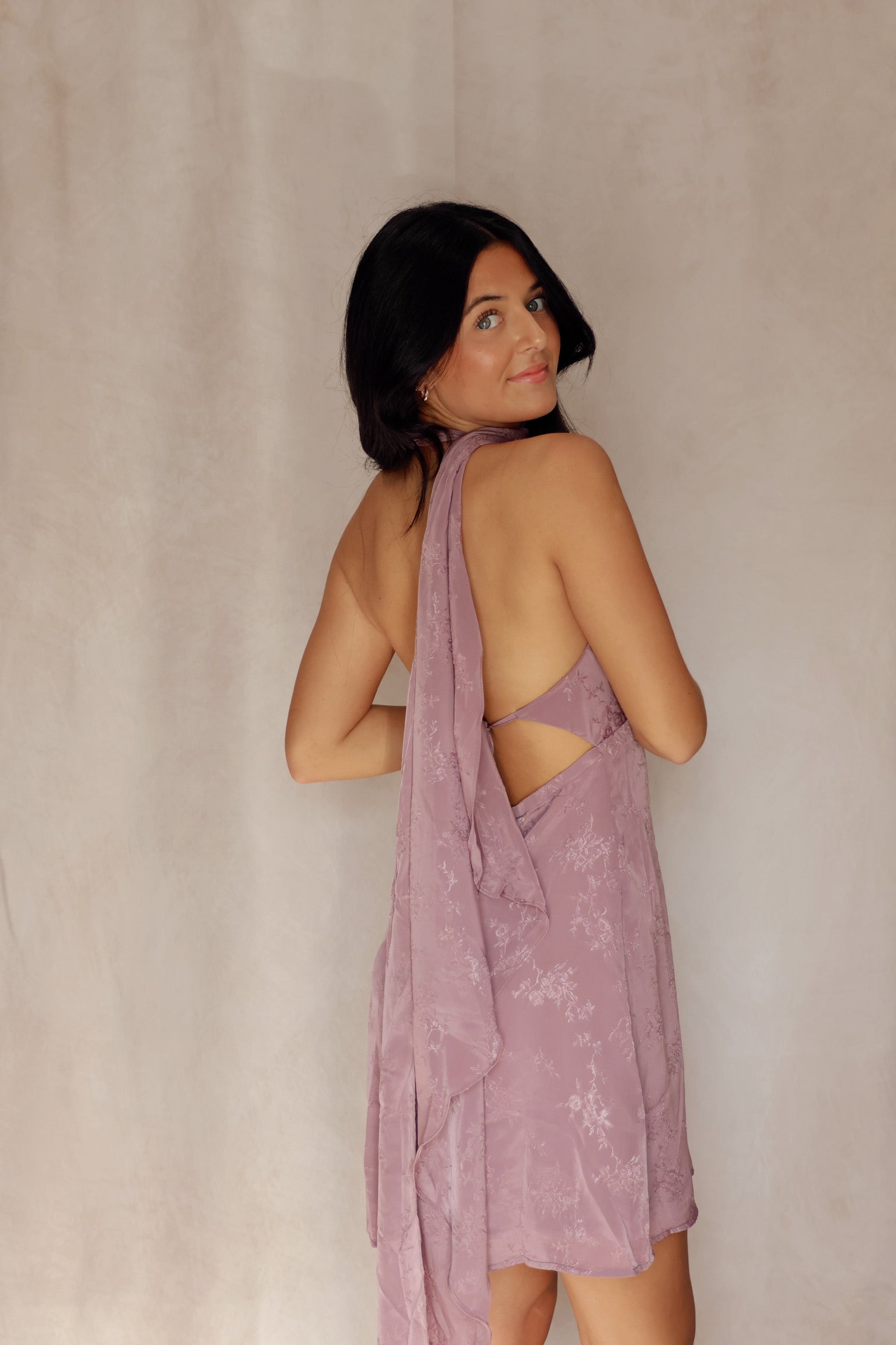 A gorgeous halter style mini dress with straight skirt featuring a neck scarf that can be worn straight back or wrapped around the neck.