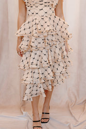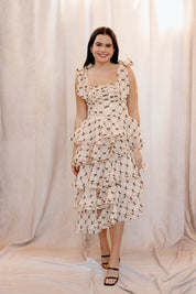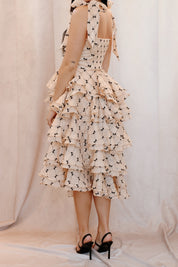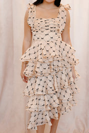 Blush organza bow printed tiered midi dress with pleats and ruffles.
