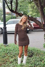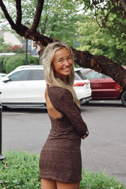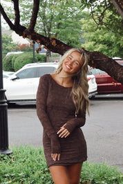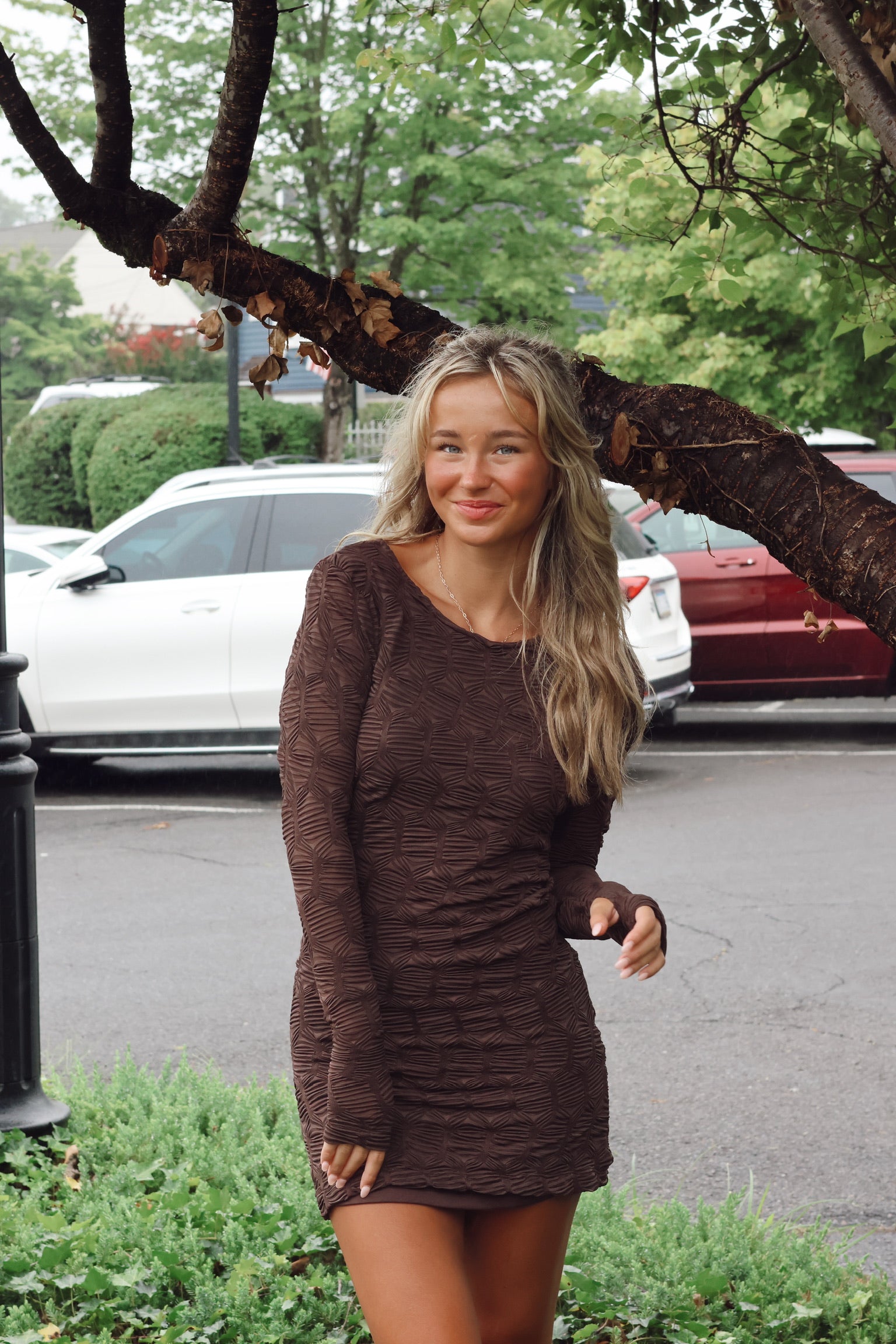 Stay warm and stylish with the Paulie Mini in hot fudge. This long sleeve mini dress is the perfect addition to your wardrobe, adding a touch of sass and playfulness to any outfit. Don't let the cold weather cramp your style, embrace it with the Paulie Mini!