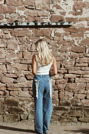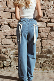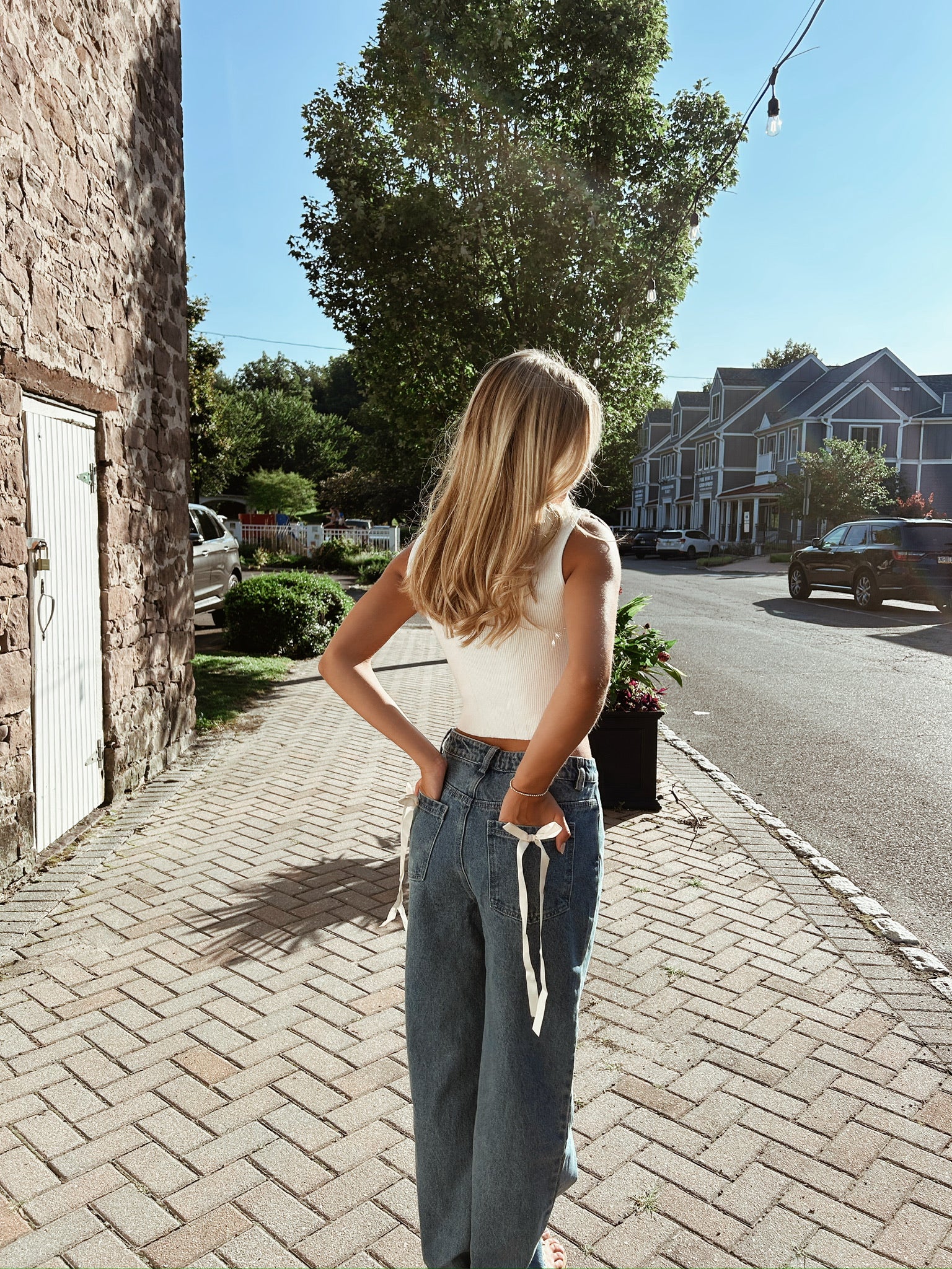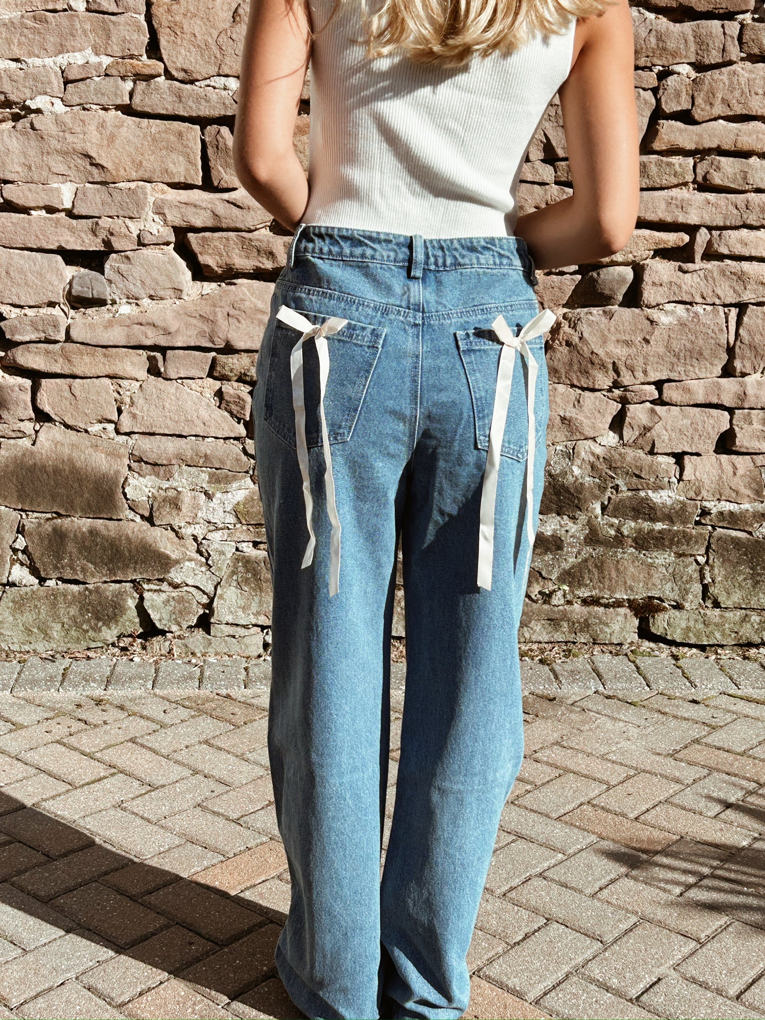NEW OBSESSION ALERT!! Denim high waisted straight leg pants feature ribbon bows on the back pockets.