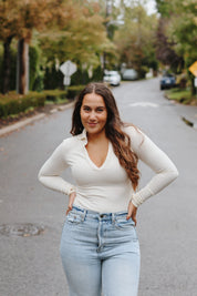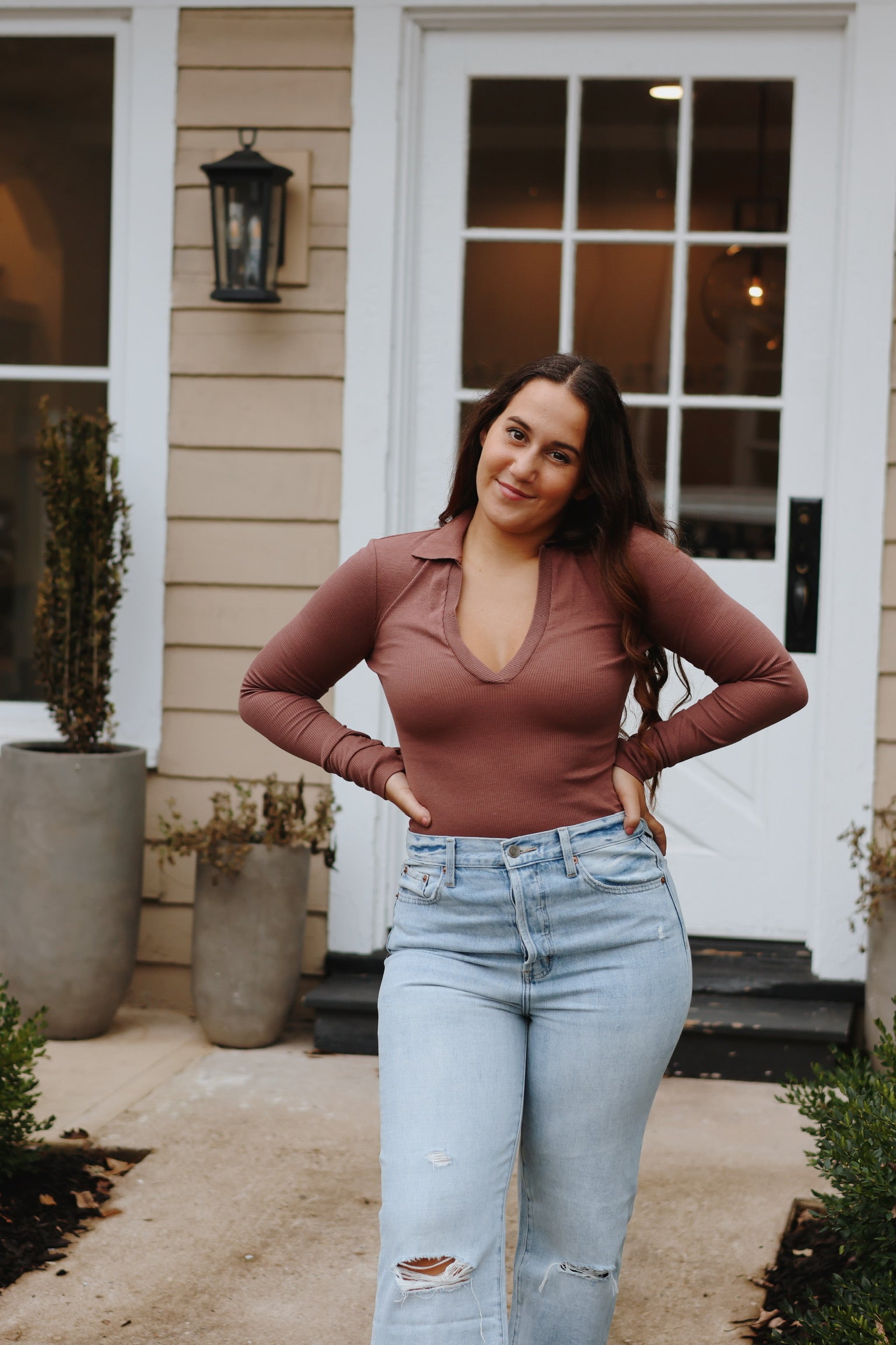 So simple and chic, this soft bodysuit is featured in a fitted silhouette and long-sleeve style with a collared neckline and thumbhole detail.