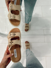 The KARRIGAN sandals feature textured woven buckle slide straps securing a flatform sole with a matching woven wrapped midsole.