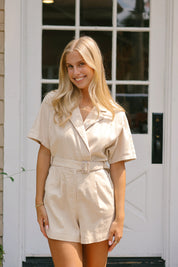 The Steve Madden Honor Romper is a stylish and comfortable one-piece outfit that is perfect for spring and summer. The short-sleeved romper made from a blend of cotton and linen will be more than ideal for a hot summer day. It features a wide lapel,v-neckline, and a belted waist to accentuate your figure.